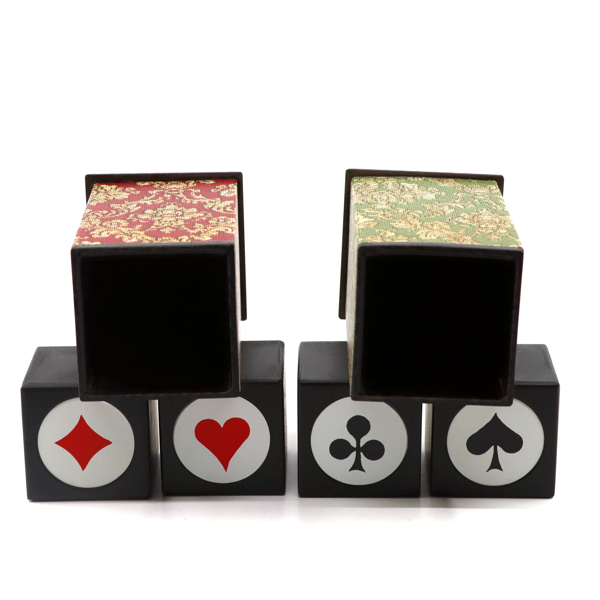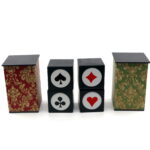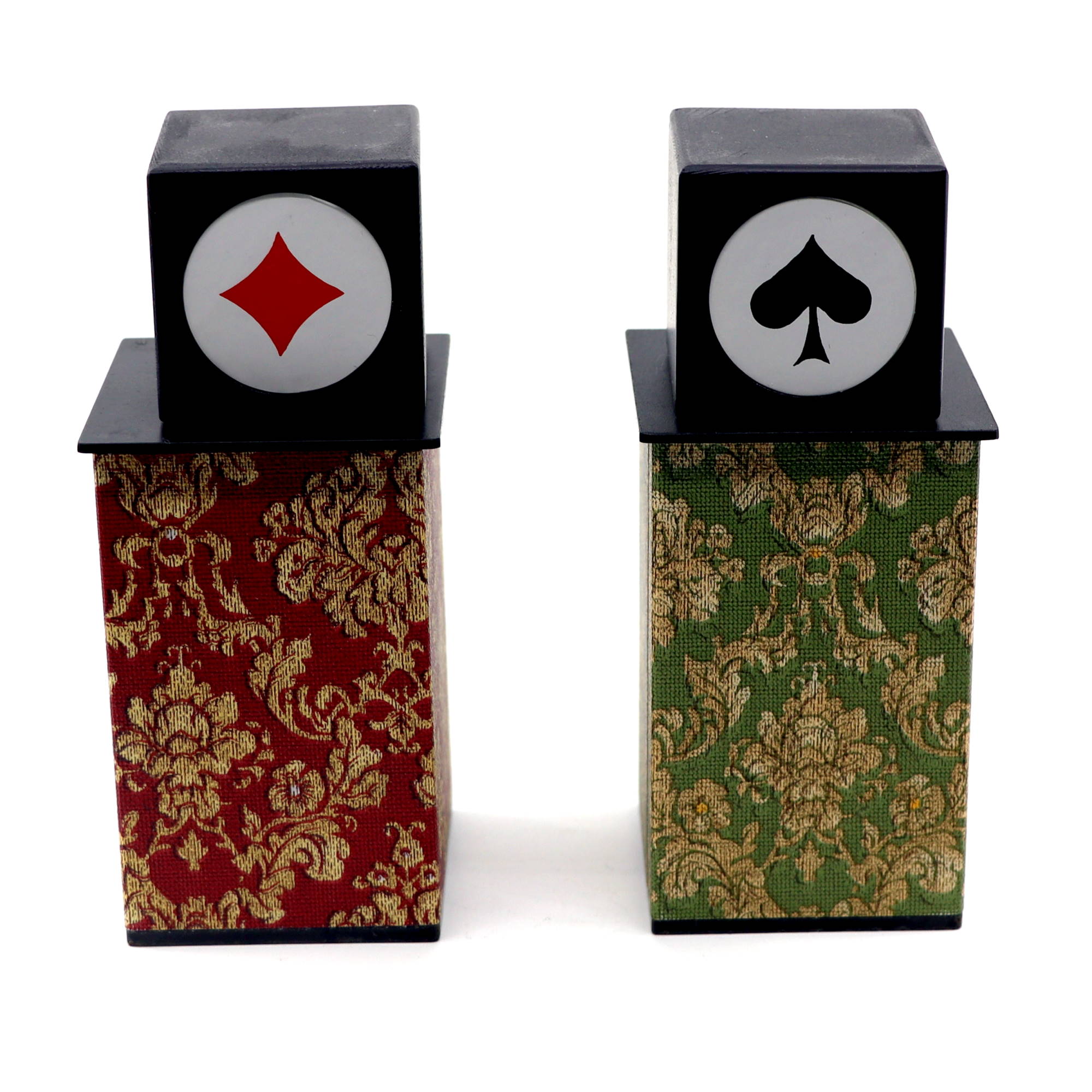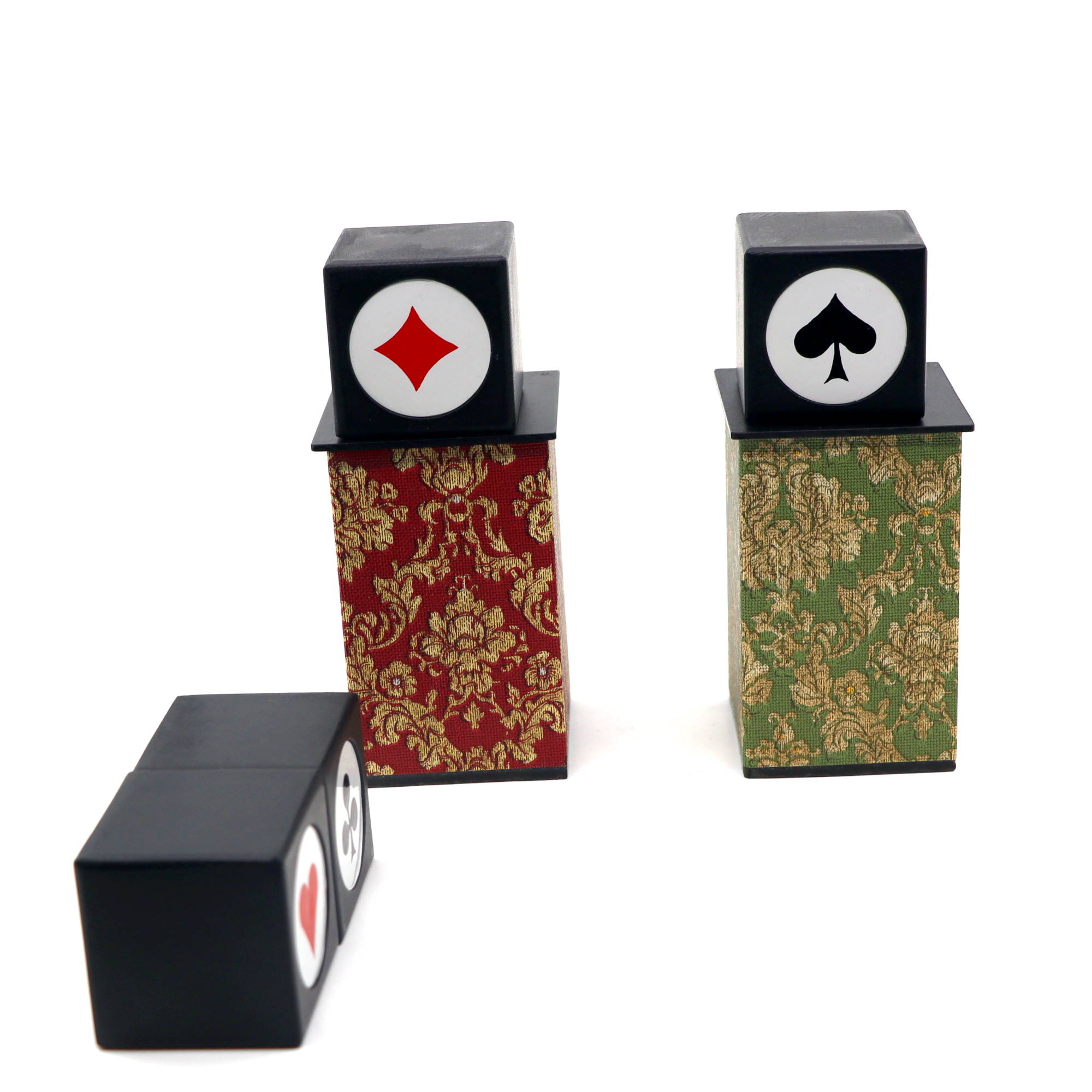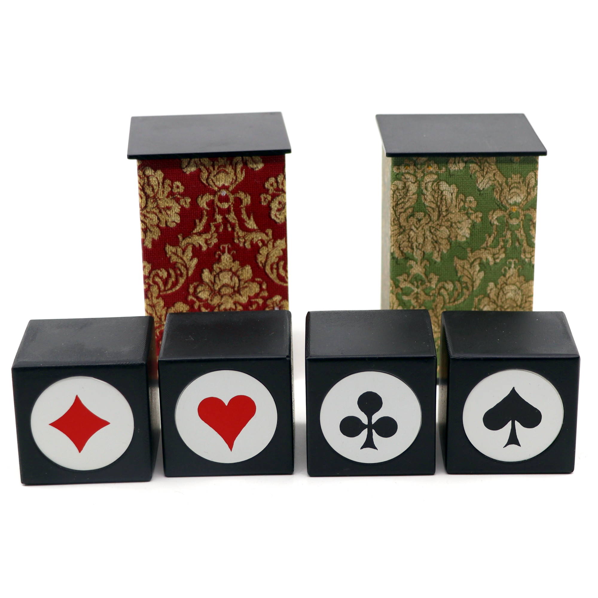 Effect: The performer introduces four small, nicely decorated dice that show the suit of a card on opposite sides, with the other sides are black. Two tubes that fit over a stack of two dice at a time are also introduced. The dice can be cleanly shown from all angles and the tubes too. In fact, if desired everything can be briefly examined though I would not hand them out for long.