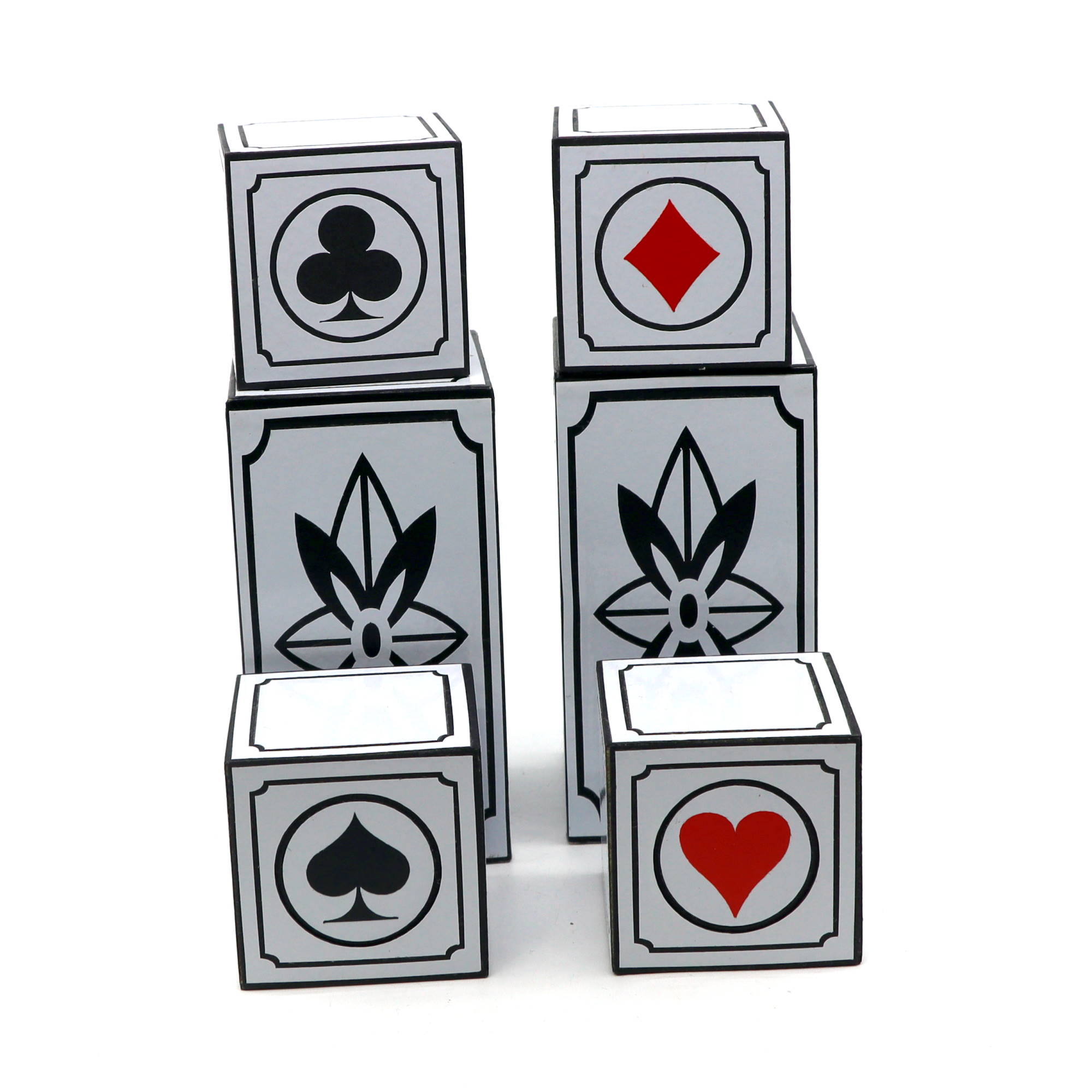 Effect: The performer introduces four small, nicely decorated dice that show the suit of a card on one side, all the other sides are white. Two wooden tubes that fit over a stack of two dice at a time are also introduced. Of course dice and tubes can be shown on both sides.