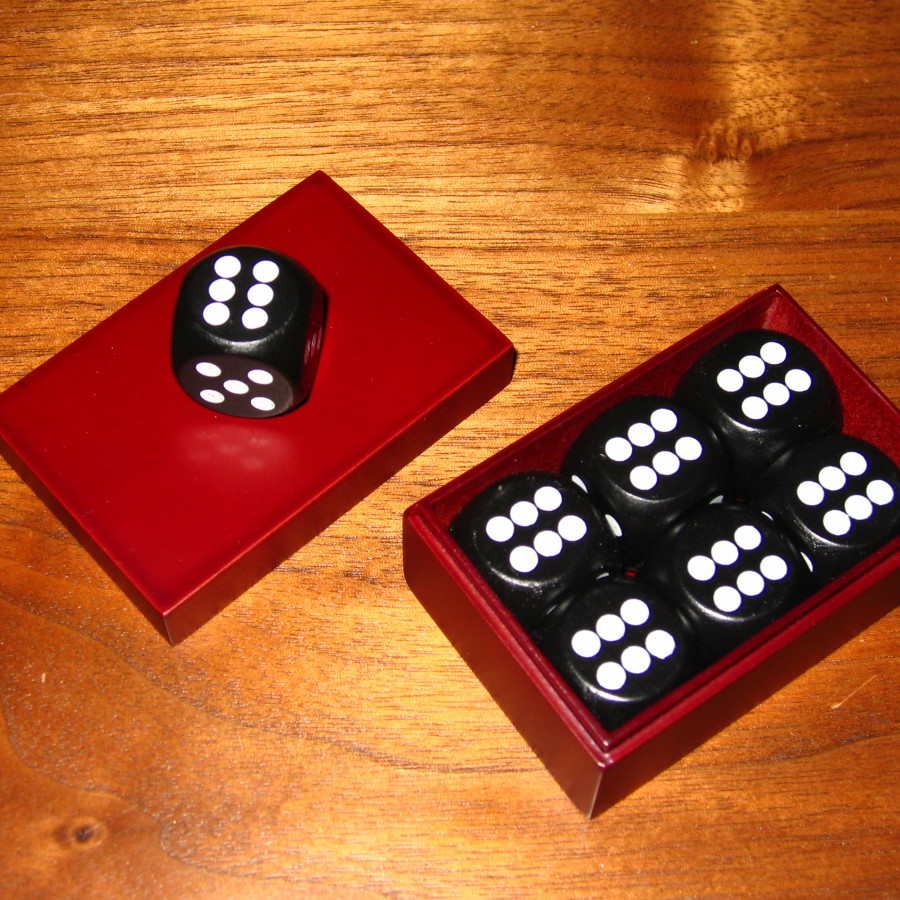 Effect: The performer displays a beautiful Rosewood box which contains six black dice. The dice are arranged in sequence from one to six. The lid is replaced and the spectator is given a die and a shot glass. He is to shake the die within the glass and then to toss the die onto the lid of the box. What ever number comes up with be the chosen number.