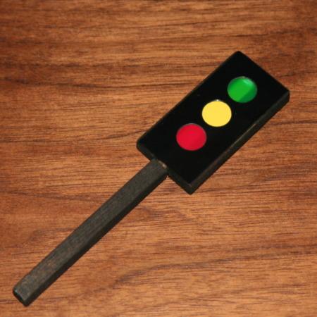 Effect: You show a paddle and tell how the three traffic lights, red, yellow and green change to all red, all yellow, and all green. Then they enlarge in size. Size of Paddle: 4 3/4″ x 1″ across top. About 500 of these were made.
