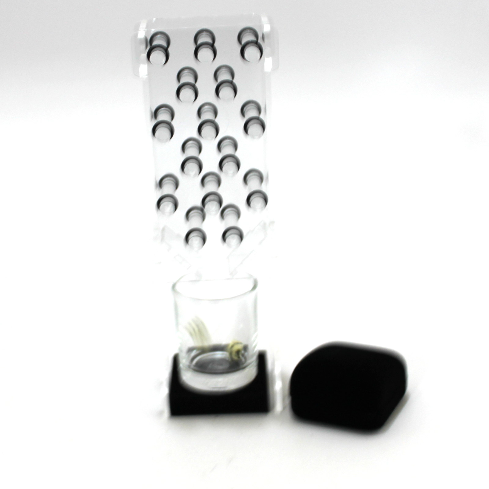 The dice tower measures approximately 2.5” x 1.5” x 8.5” high and is nicely made of clear Acrylic with an array of 15 internal pegs to ensure that your dice rolls are truly random.