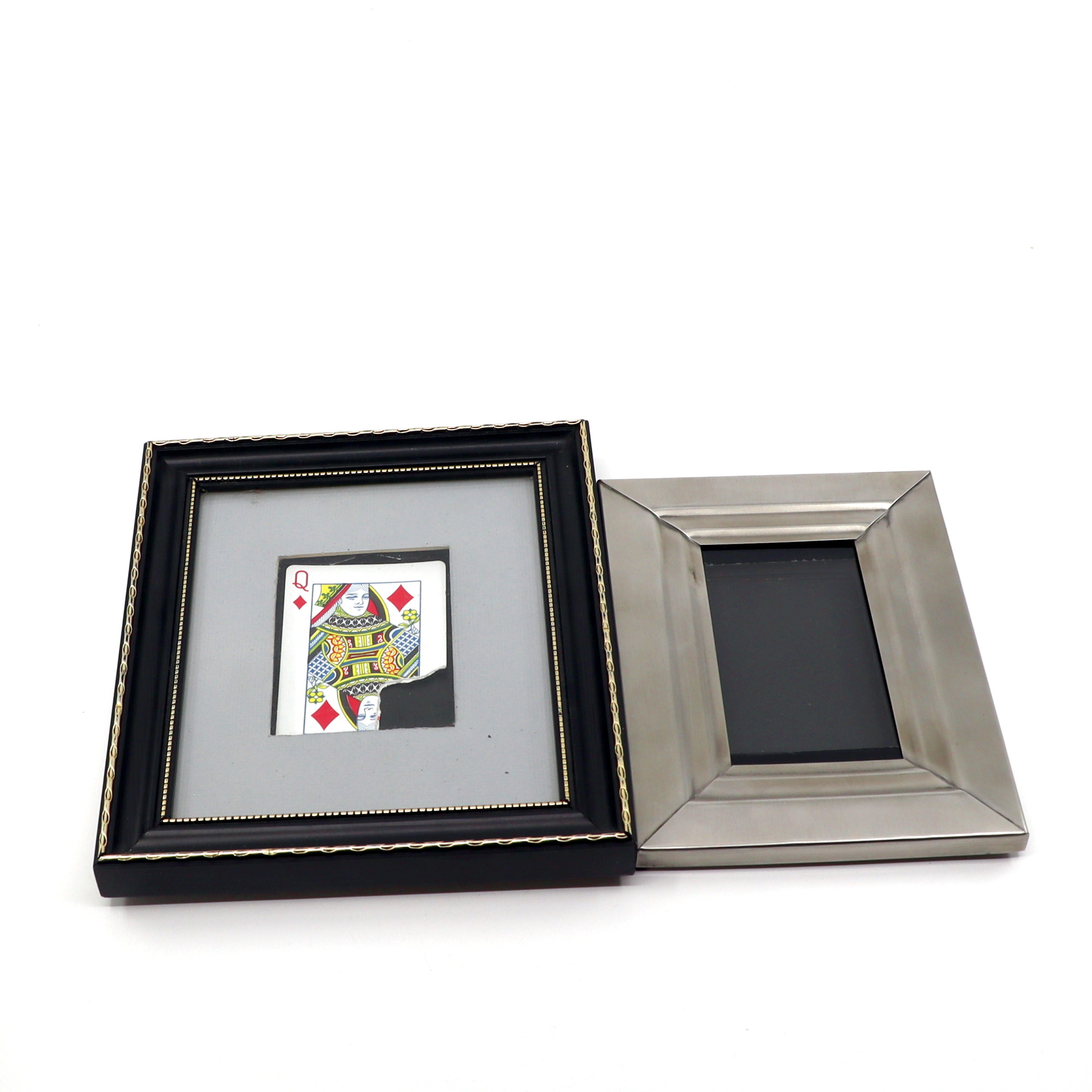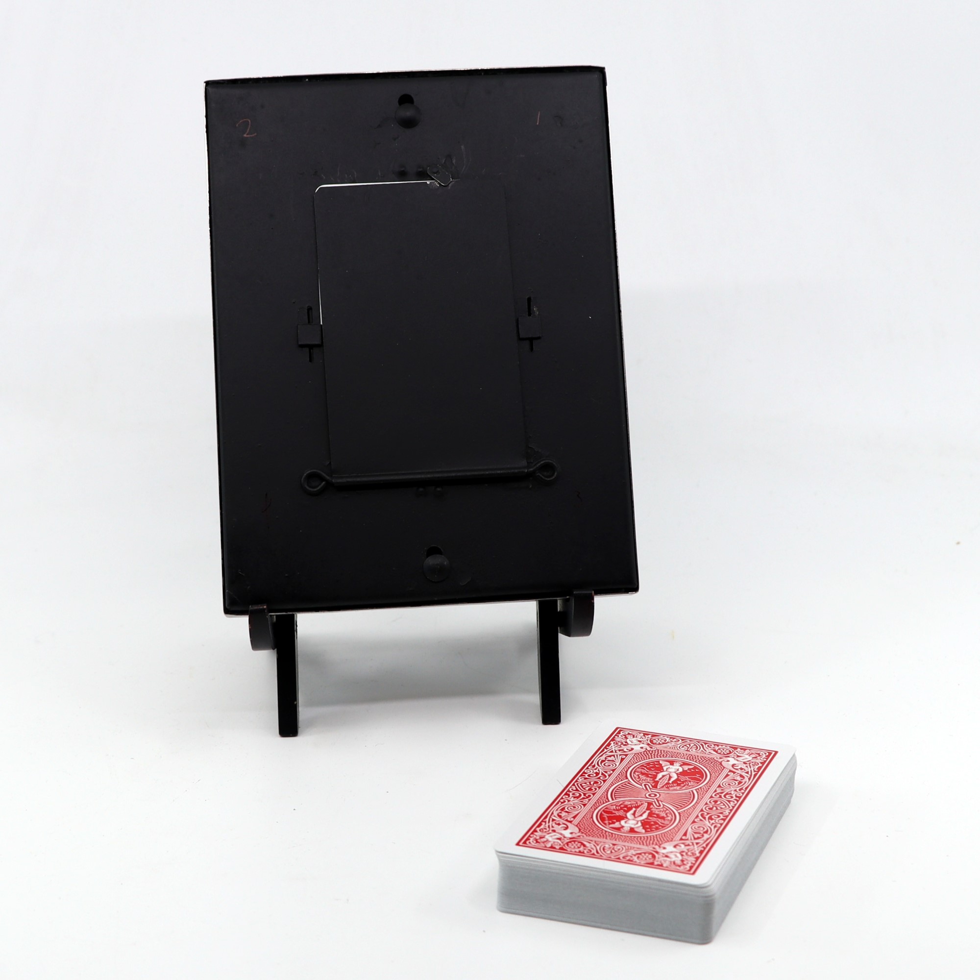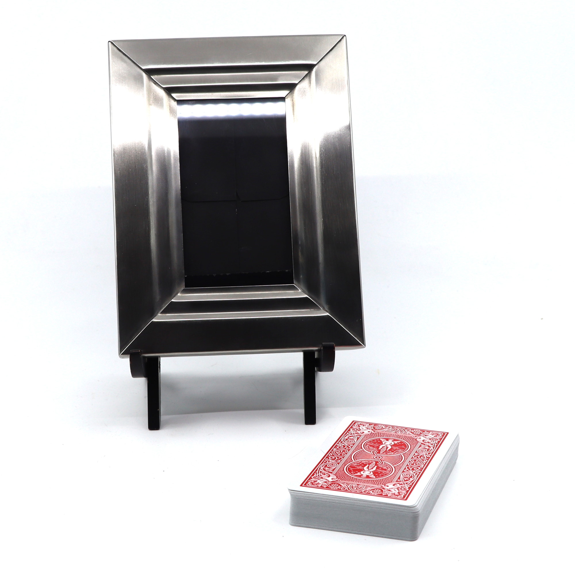 The three remaining pieces are then vanished using your favorite method (something like the P&L Ultra Perfect Card box is just the ticket). Then the magician pretends to through one piece at a time towards the frame and they magically appear inside-beneath the glass-like a jigsaw puzzle.