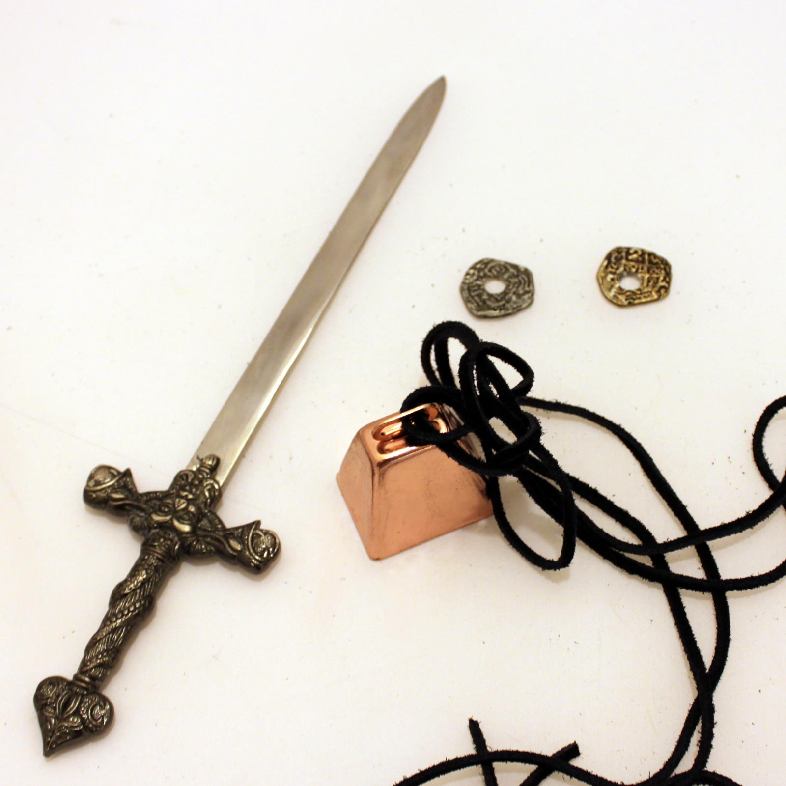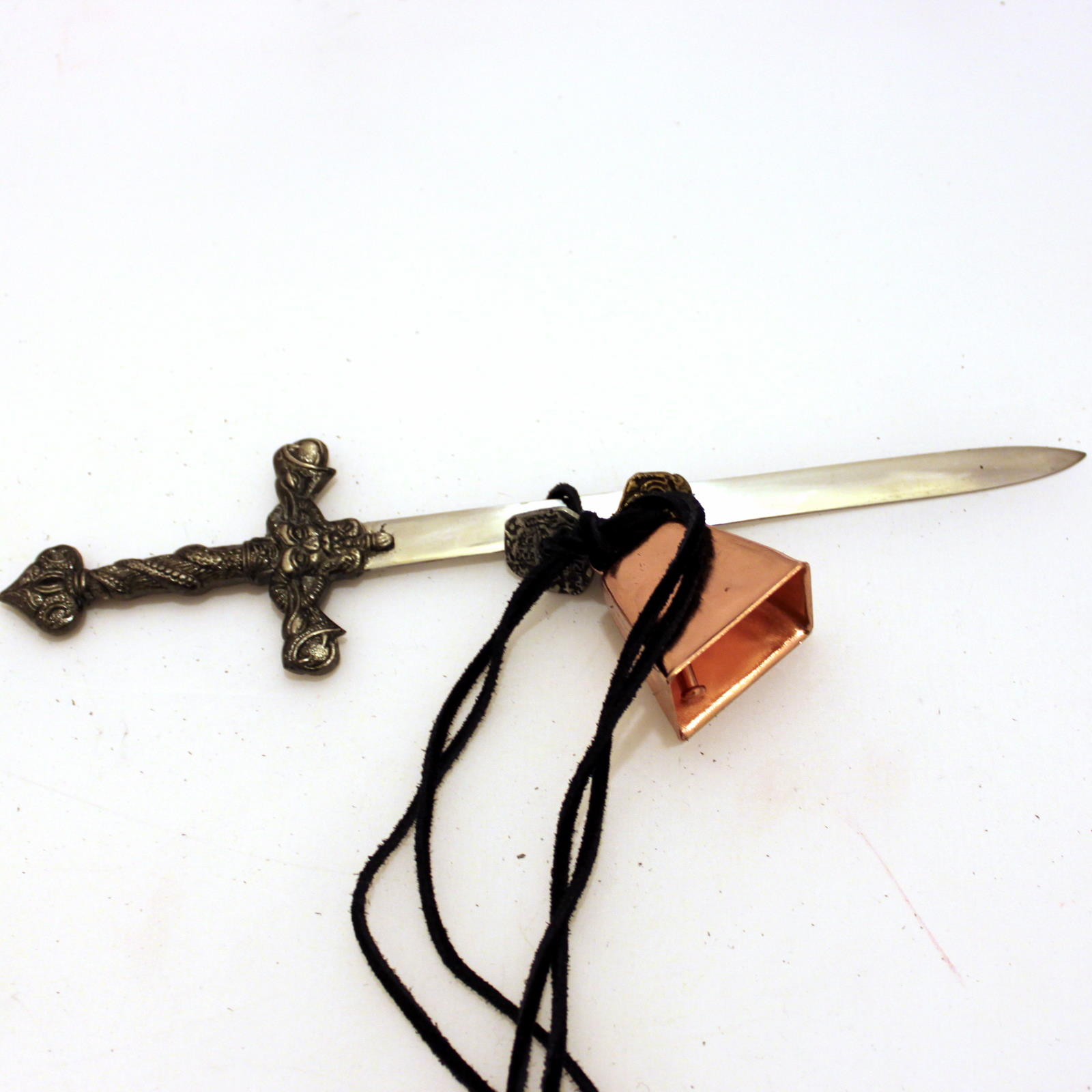 You are provided with a replica of an old style sword. It includes a sheath to protect your sword and a cap to protect you. It measures 11” in length. You also receive a copper cow bell, 2 leather cords, and 2 coins of old and of course the instructions.
