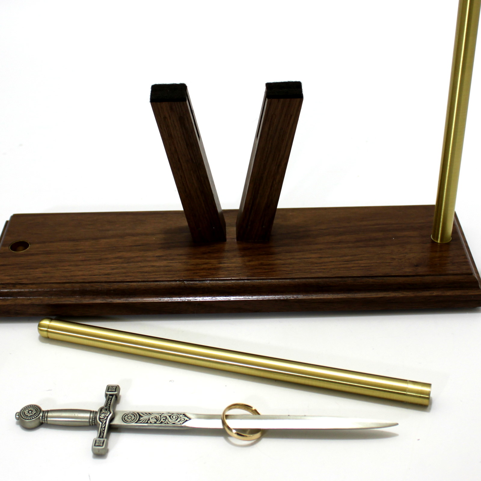 Effect: “Legend has it that the family of a fallen warrior of a little known Asian tribe would receive a replica of his sword. Mounted in a fixture such as this, it was kept in a prominent place in the family home. For the most part, the display would be cloaked in a protective cloth. (Performer places a silken bag over the display.) On ceremonial occasions, the bag would be removed, and as a gesture of continuing homage, loved ones would remove their rings and place them on the sword. Recently discovered writings suggest that, from time to time, examples of psychokinetic’s would be observed. It’s my intention to attempt such an experiment.”