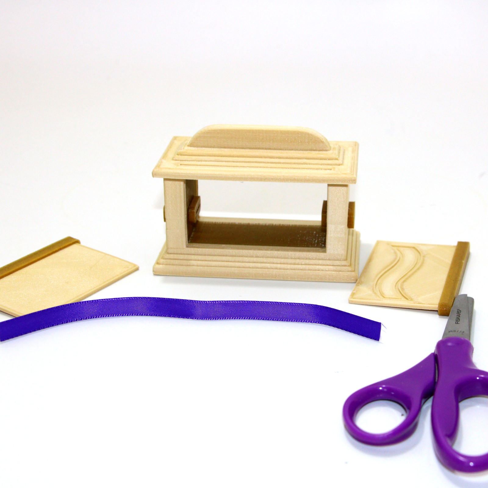 Effect: An ornate box, with removable front and rear slide panels, is presented with the two ends of a length of ribbon protruding from holes on each end/side of the box. The performer removes the front and rear slide panels to reveal that the length of ribbon does go through the box. The performer pulls on one end of the ribbon to straighten it out inside the box and to show that it freely moves back and forth through the holes on the side of the box. The performer then pulls on the other end of the ribbon to bring the ribbon back to its original position.