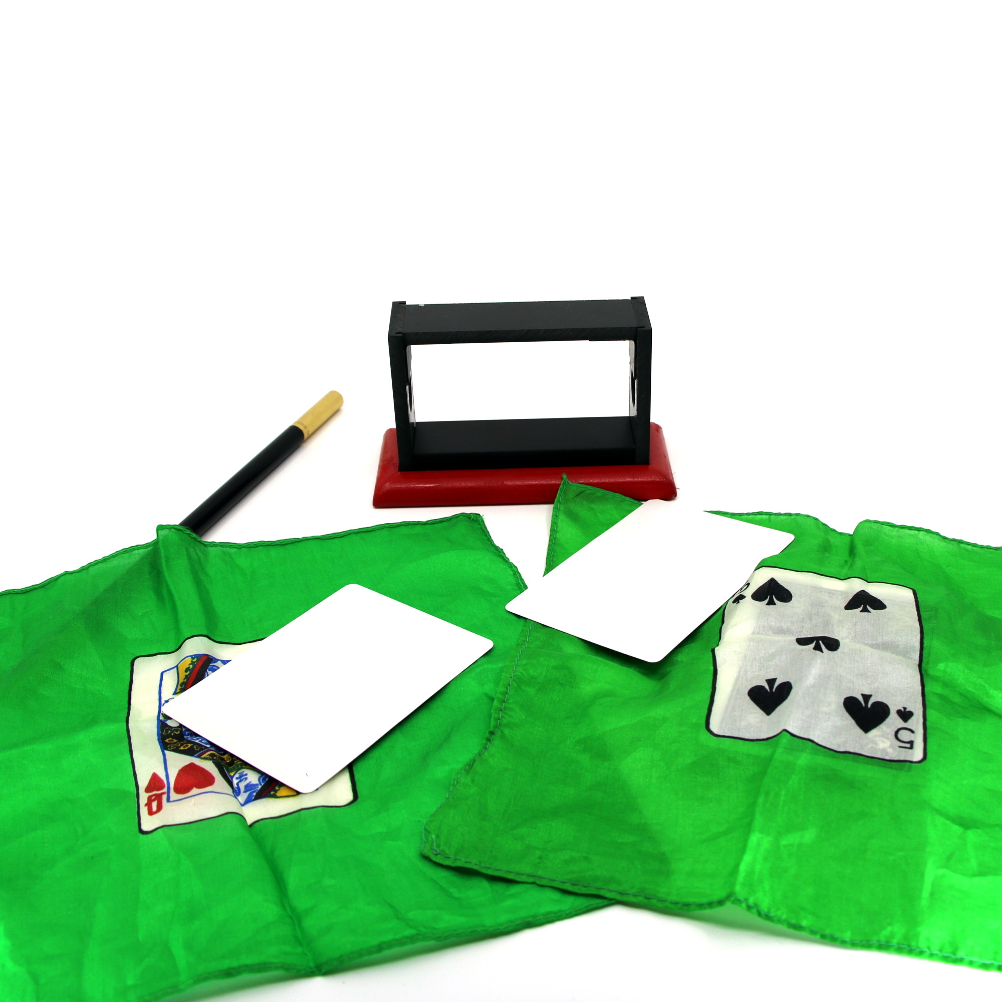 You show the spectators two BLANK CARD silks. You push the silks through the holes at the ends of the cabinet as a demonstration. Of course they come out at the other end as blank as they were before.