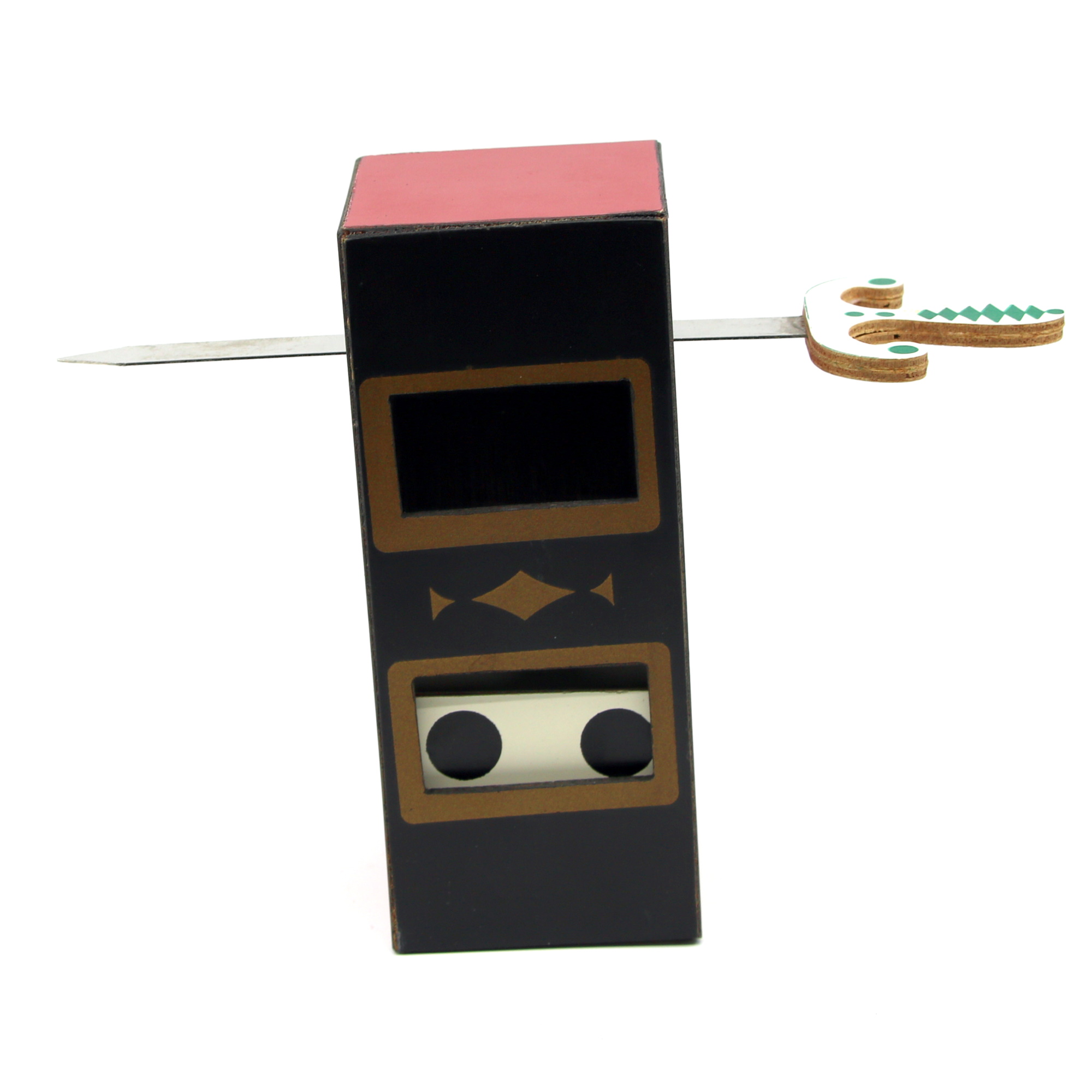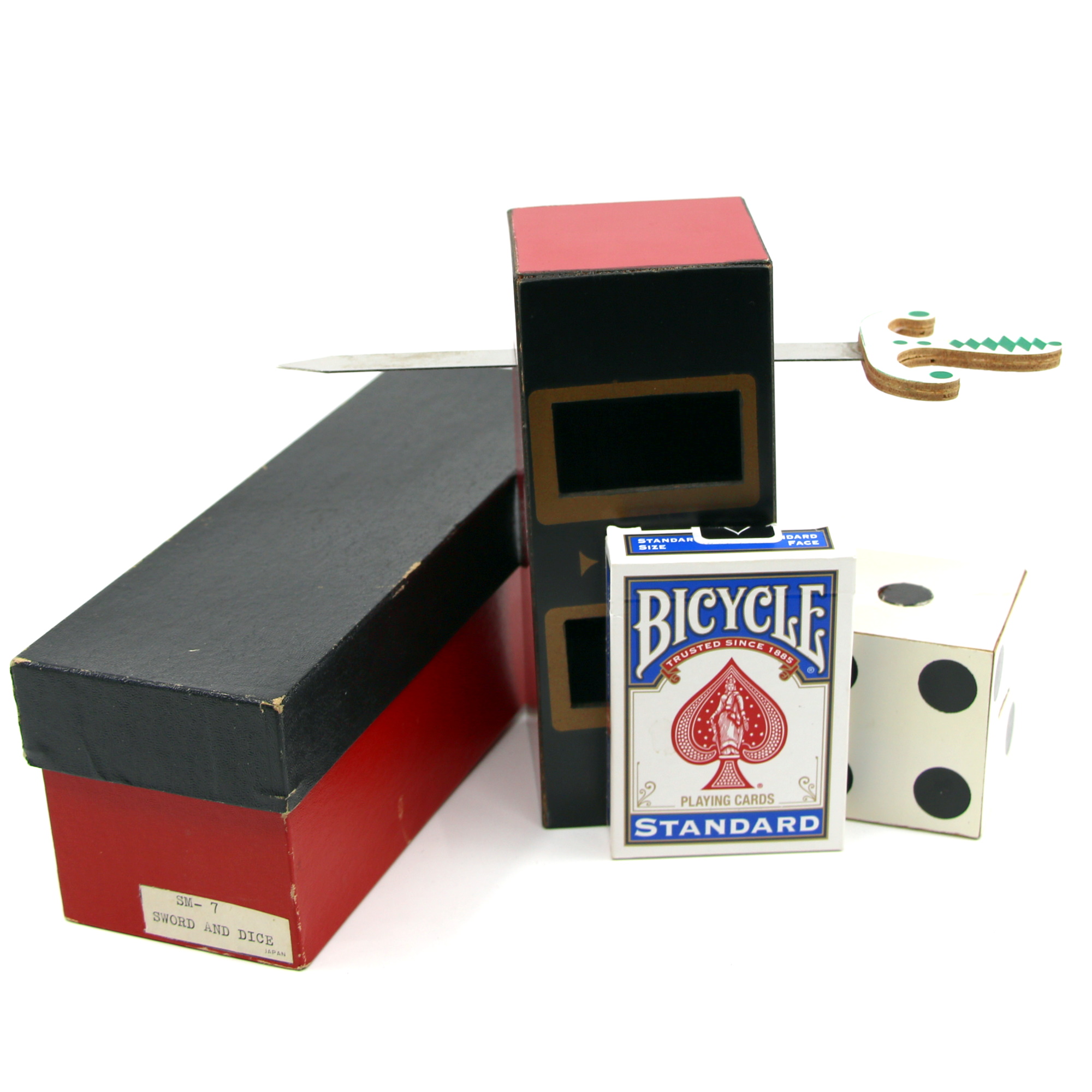 Effect: A die is shown and put into an oblong box which has two windows. A sword is put through the box so that it penetrates the die and thus holds it captive. The performer causes the die to escape from the sword and it falls free from the box.