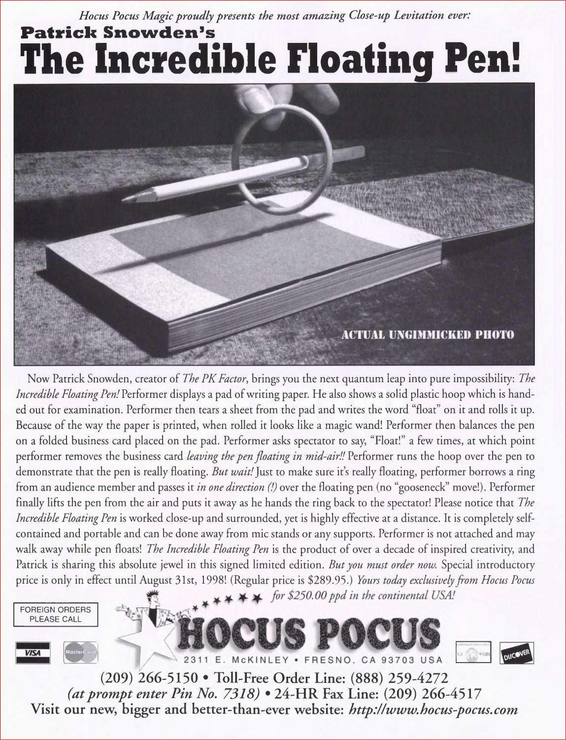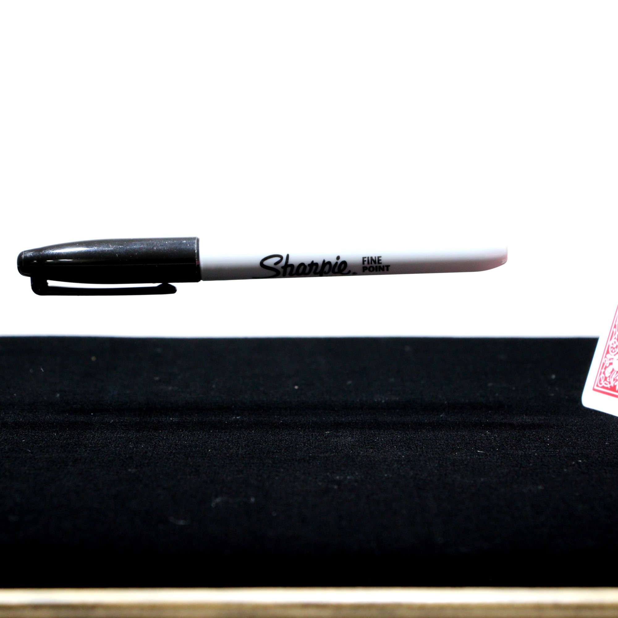Effect: A Sharpie or BicStick type pen is displayed and may (if wished) be examined. Two small pieces of folded paper are placed in the center of your close-up pad and the pen is placed upon the top edges of the folded strips. One strip is removed, leaving the pen impossibly balanced by the remaining strip. Then, after a bit of teasing, the second strip is slowly removed and the pen is seen to float, impossibly, over the close-up pad. The performer’s hands are passed under and over the levitation pen, and finally, a small, solid ring (even a borrowed finger ring!) is passed over the pen in ONE direction! (no ‘gooseneck’ move) The pen may be plucked from the air and handed (with the ring) immediately to a spectator.