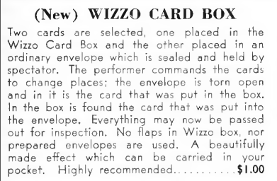 Two cards are used, one placed in the Wizzo Card Box, and the other card into an ordinary envelope which is sealed and held by spectator. At command, CARDS CHANGE PLACES.