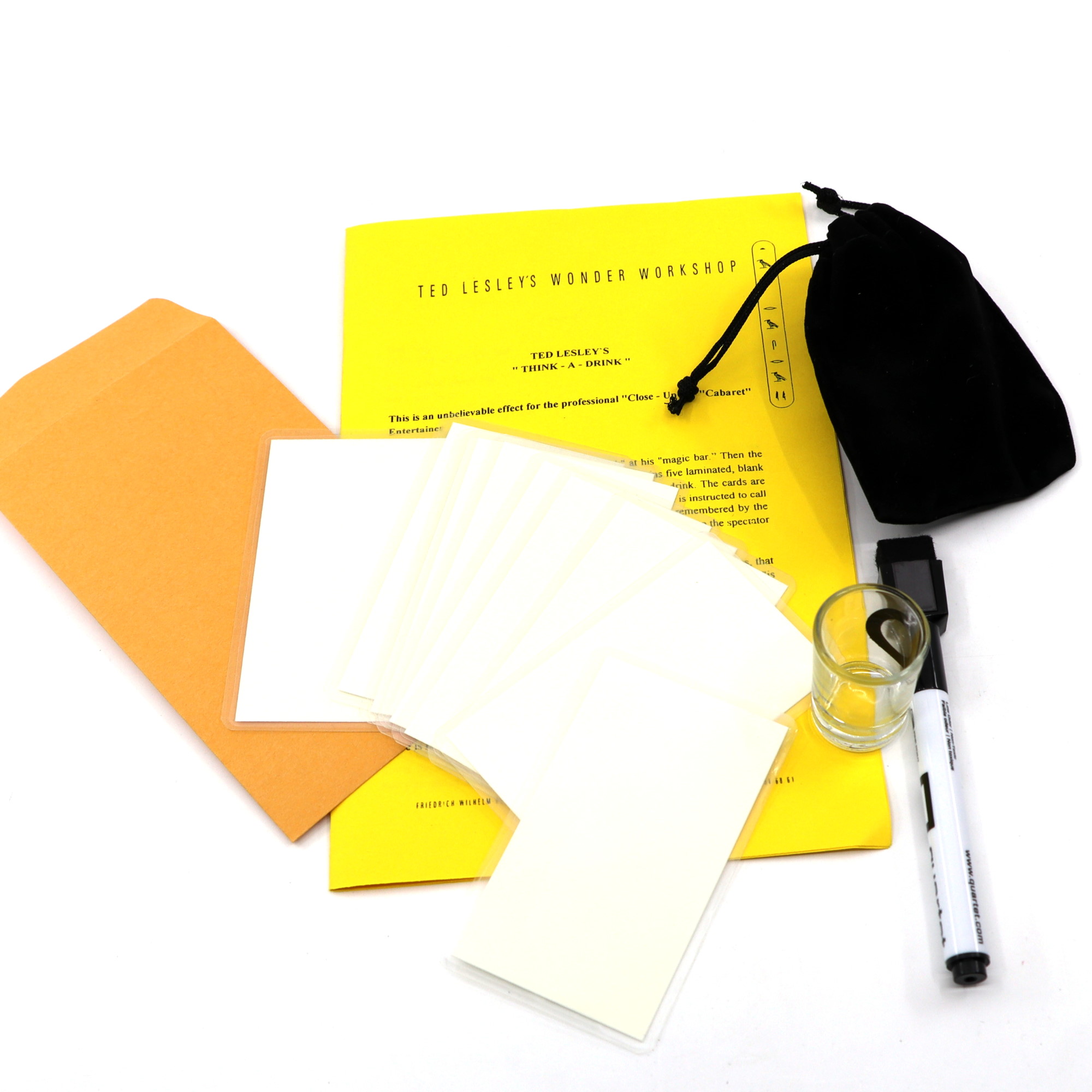 The performer invites a spectator to “have a drink” at his “magic bar” Then the entertainer takes an envelope out of his pocket that contains five laminated, blank faced playing cards. Each card is imprinted with a different drink. The cards are turned face, down and shuffled by the performer and the spectator is instructed to call “STOP” anytime during the shuffle. The card stopped at is remembered by the spectator. Then the cards are put back into the envelope and handed to the spectator to hold.