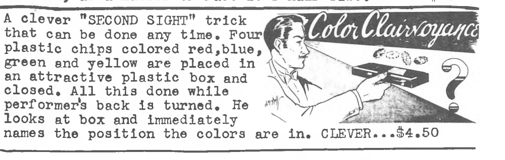 This little box was made in Germany and it is a bit like a poor man’s Jewels of Shah Jahan – you can perform the same effect for a fraction of the cost. I am not sure if Bert Wheeler’s Hollywood Magic were the first company to import this item, but they were the earliest ad I could find. It was also sold by Paul Diamond, Tannen’s and others under the name Color Clairvoyance.