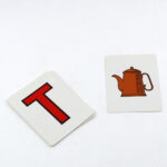 The letters are arranged to spell the word “POT”. The fourth card is turned face-up, and on it is seen a picture of a teapot, to match the word.