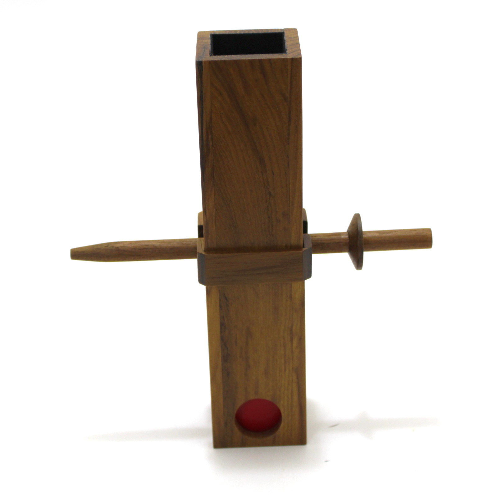 A beautiful wooden tube, a wooden “sword”, along with a bright red block with a hole running through its center are displayed. The performer then openly inserts the sword through the holes in the sides of the tube, blocking its passage. The block is then dropped into the tube where it is heard to stop as it hits the sword. Now, the performer merely taps the tube against the palm of his hand and to the spectator’s surprise, the block magically penetrates the sword and ends up visibly in the window at the front of the tube! The sword is then removed and shown to be perfectly solid!
