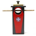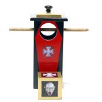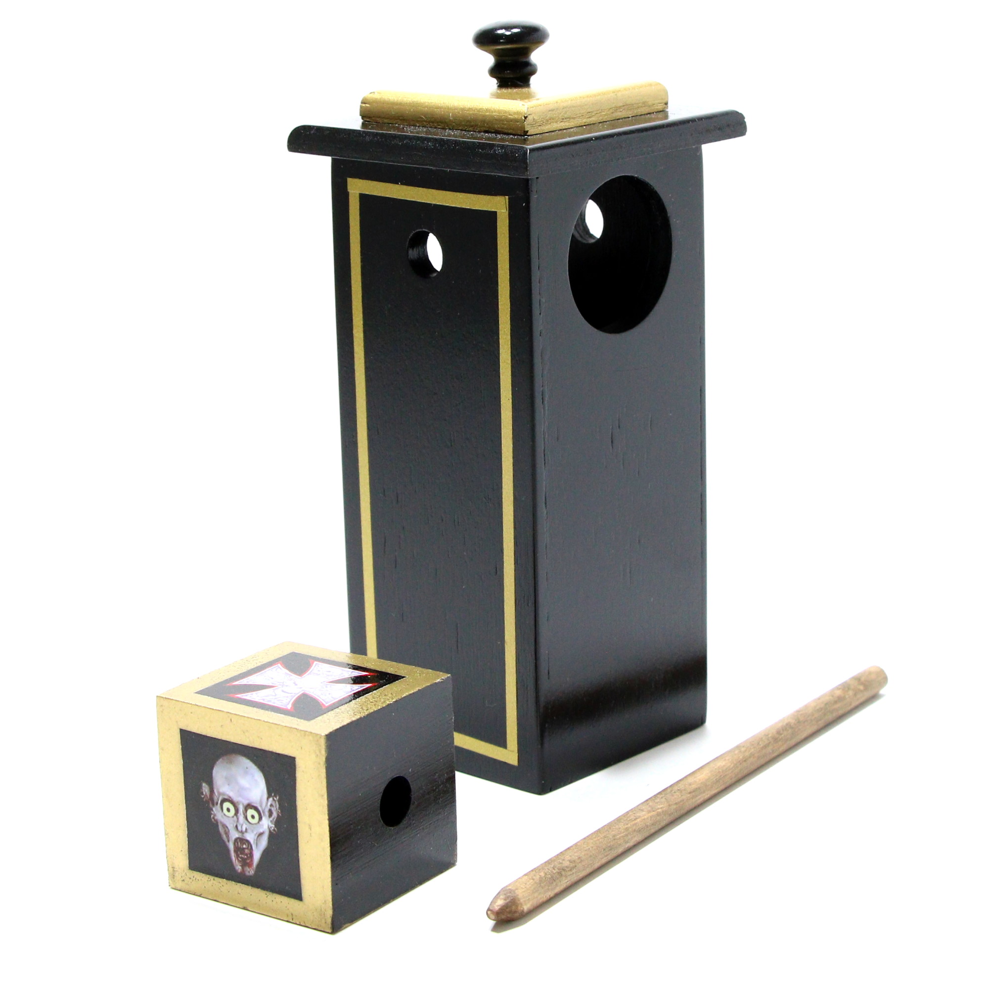 Effect: Three items are shown: a vampire block with a hole through its center, a square tube, and a wooden stake. The block is inserted into the tube, where the vampire’s face is visible through a cutout opening at the front The stake is run through holes in the side of the tube, and through the corresponding hole in the block, effectively locking the block within the tube. On the magician’s command, the block visible falls from the tube, the vampire escapes, apparently penetrating the stake in the process!