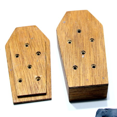 The performer now asks the spectator to place a sword, partly through one of the holes in the lid of the coffin. The hole should correspond with the part that is separated on his chosen card. The performer now states. “You have now put a voodoo curse on the effigy!”
