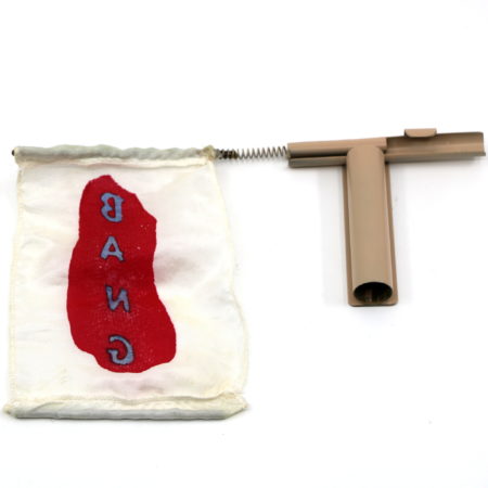 Here are the, er…, theatrics. Performer points finger in time-honored manner and says “BANG”. And, a little white flag drops from his finger with the word “Bang!” on it.