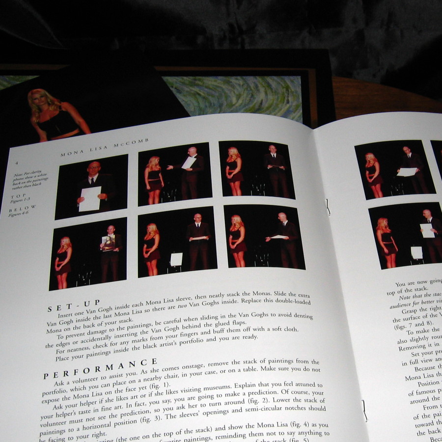 He now explains to the spectator that she will make a random choice from a stack of several reproductions of paintings. The performer holds up the paintings so the audience can see them, but not the volunteer, who is unaware that all the paintings are the Mona Lisa. The audience laughs as it realizes the performer is about to con his lovely volunteer.
