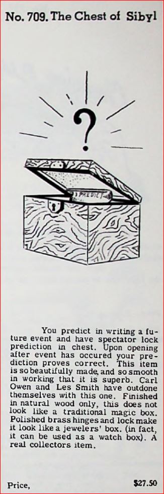 Effect: You predict in writing a future event and have a spectator lock the prediction in a chest. Upon opening, after the event has occurred, your prediction proves correct. This item is so beautifully made, so smooth in working that it is superb. Finished in natural woods only, this does not look like a traditional magic box. Polished brass hinges and lock make it look like a jewelers’ box. In fact, it can be used as a watch box with built in rattle. A real collector’s item.