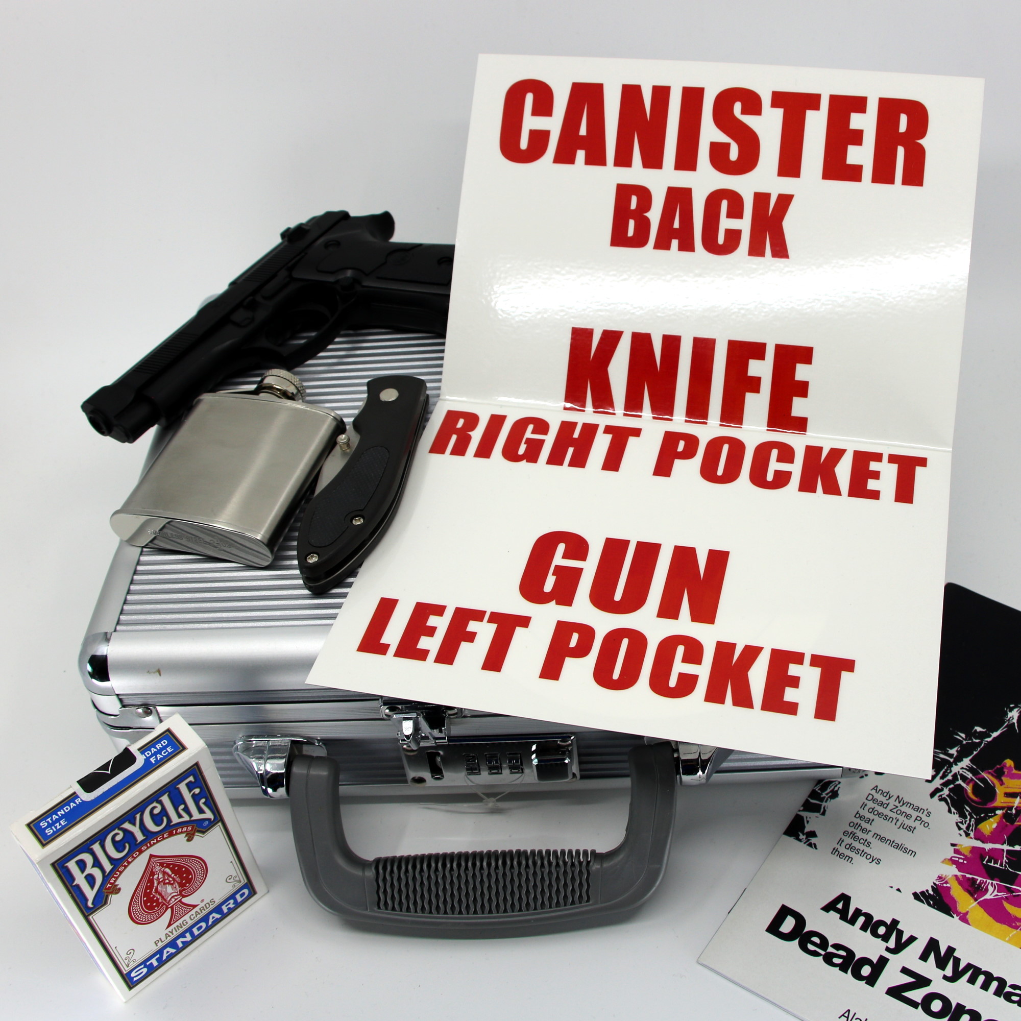 At this point you explain that you imagine the “Dead Zone” as a target and then proceed to stick a picture of a target onto the spectator then ask him to imagine that he is an assassin and draw his attention to the case on the table. You explain that it contains a selection of weapons that may be used by an assassin and ask him to open the case and take a look inside.