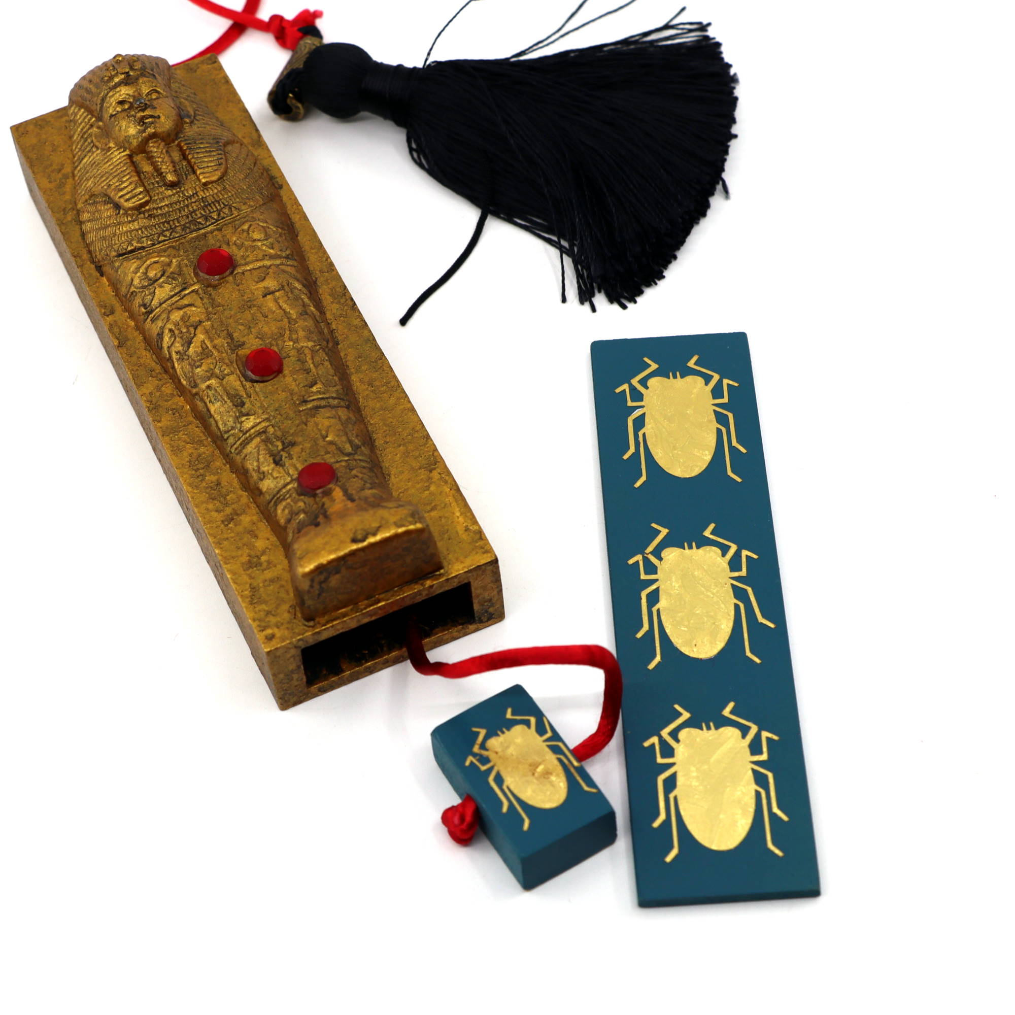 Effect: The performer displays a beautiful little (2″ x 5 3/4″ ) Egyptian Sarcophagus of gilded gold. He states that this treasure was plundered from a tomb directly beneath the alter of Isis-the wife of Osiris and mother of Horus. Isis symbolized, among other things, the perfect mother. Isis is said to have loved all children, once even granting the gift of Intuition and Knowledge to all mothers as a way to keep their beloved children safe. He explains that it has been said that the small sarcophagus contains the very essence of Isis herself. At this, the performer removes three colored tablets from the sarcophagus, each one with a different hieroglyphic symbol on it-an Ankh, two Plumbs and three Scarabs. The performer states that Isis, being the all knowing mother she is, has already predicted a chosen tablet. A spectator is then asked to name out loud any of the three tablets. Once named, the spectator is even given the option of changing their mind. After a tablet is settled on, the performer shows how Isis had already predicted their choice in a very astonishing way!