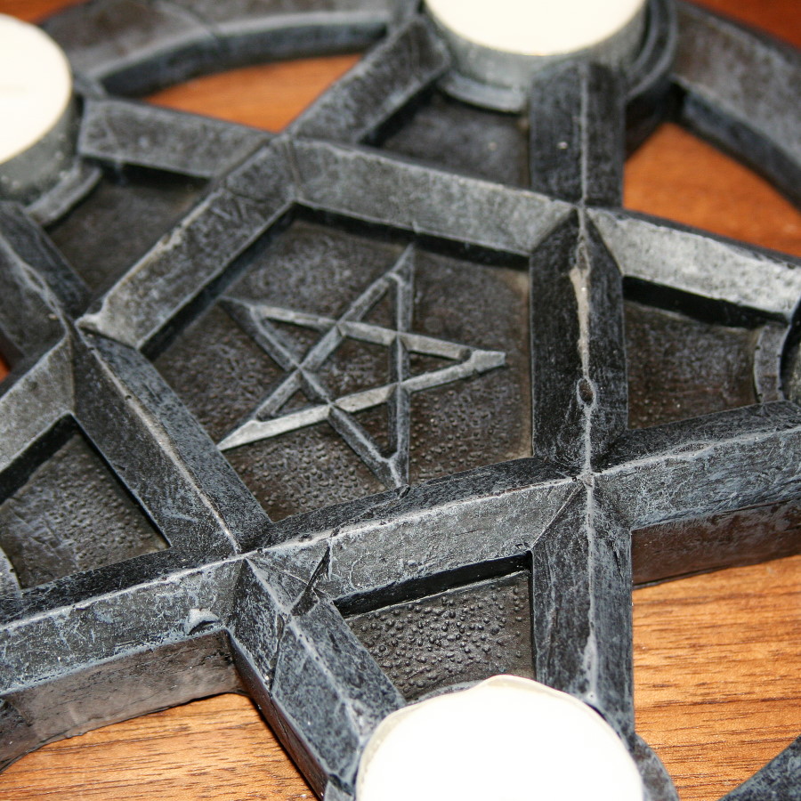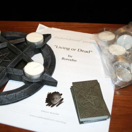 The second routine could be quite frightening, as a candle holder in the shape of a pentagram is used along with some tea lights and printed cards. Four spectators write the names of living persons on their cards, a fifth writes the name of a deceased relative on theirs. The cards are mixed and placed around the pentagram, one near each candle. As the group concentrates, one of the tea lights suddenly goes out. The card next to the extinguished flame bears the dead person’s name.