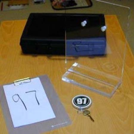 (c. 2001) (Submit Review) (Submit Update)Effect: Begin your routine by displaying a hotel key with plastic room number tag and hanging it from a clear acrylic base, with the room number facing away from the audience. Two random spectators then select a single digit number, thus arriving at a freely selected two-digit number. The magician then picks up the key, which has been in plain sight the entire time, and turns it around to reveal the selected number printed on the back of the plastic tag.