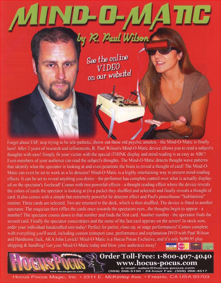 (c. 2006) (Submit Review) (Submit Update)Effect: Forget about ESP, stop trying to be tele-pathetic, throw out those old psychic amulets – the Mind-O-Matic is finally here! After 2 years of research and refinements, R. Paul Wilson’s Mind-O-Matic device allows you to read a subject’s thoughts with ease! Simply fit your victim with the special iTHINK display and mind reading is as easy as ABC!