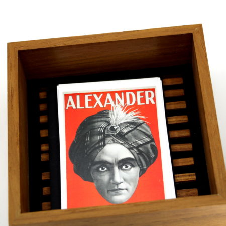 “Alexander’s mind was so powerful he would always make you see what he whats you to see. Let’s try something without Alexander this time. I’m going to place this prediction of Alexander inside the box, and cover it with the tray. Now choose any one of these other magicians. Houdini? Ok now lift the tray and open the prediction – can you see it has now changed from Alexander to Houdini?”