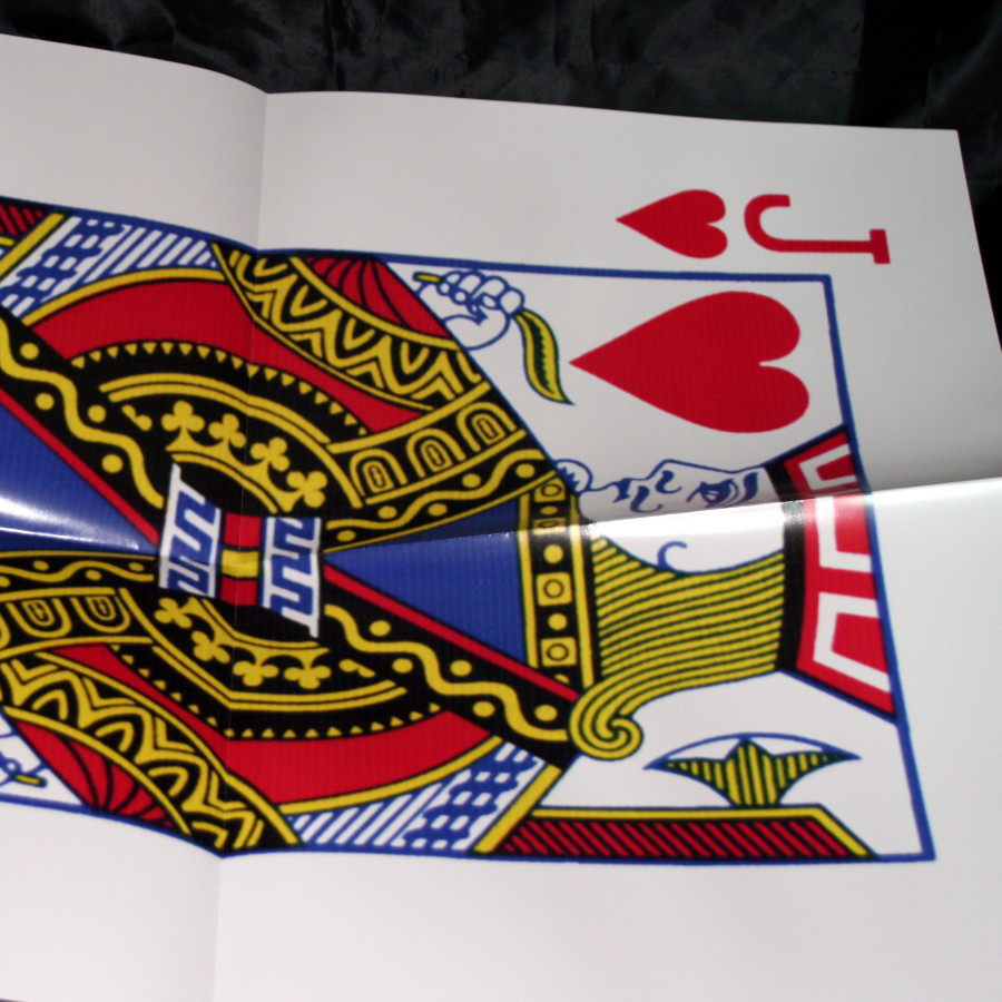 When the laughs and groans subside, you return to the spectator’s card. You show a large white image and claim that it’s the selected card in the midst of a blizzard. But you quickly explain that you always have to look at the big picture, as you unfold the picture into a giant 18″ x 24″ poster of the spectator’s chosen card and accept your applause for finally performing a truly magical prediction.