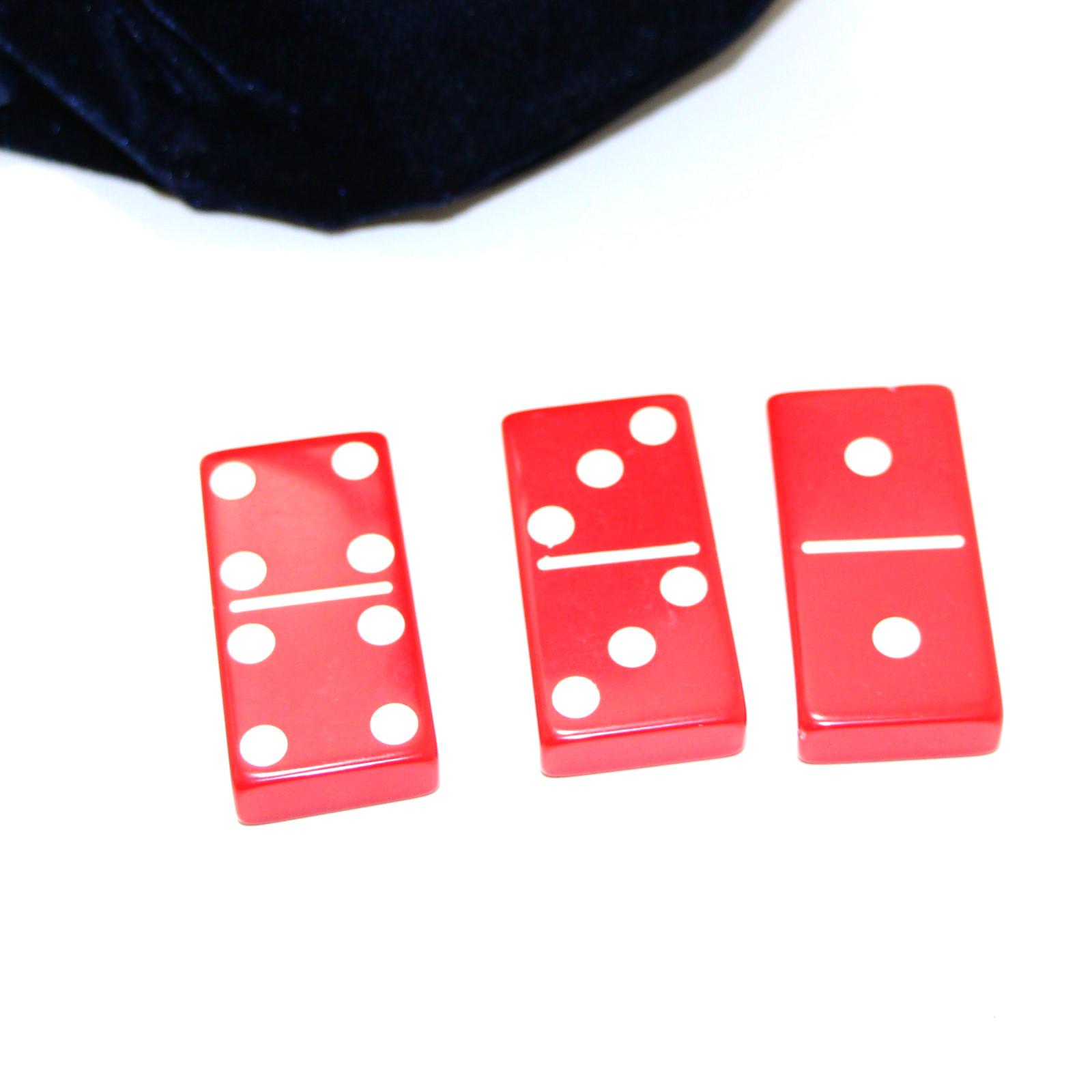 Effect: A standard set of dominoes is displayed and a prediction is made. The dominoes are placed into the velvet bag, shaken and spilled on the table. All the face down dominoes are removed. The remaining face up dominoes are collected, placed in the bag and the process is repeated until just one domino remains – it always matches the prediction – which can be different for repeat performances.