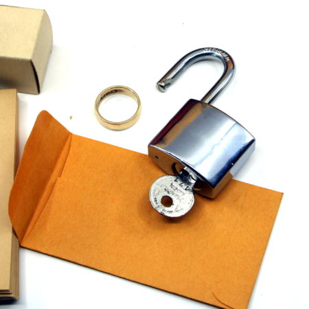 The performer now explains that he will leave the room, and in his absence they are to remove the ribbon from the key, place all seven keys in a hat, shake them up, and then place each key in an envelope and seal, each spectator to hold an envelope in his hand. Performer now returns and immediately locates the only key that will open the lock.