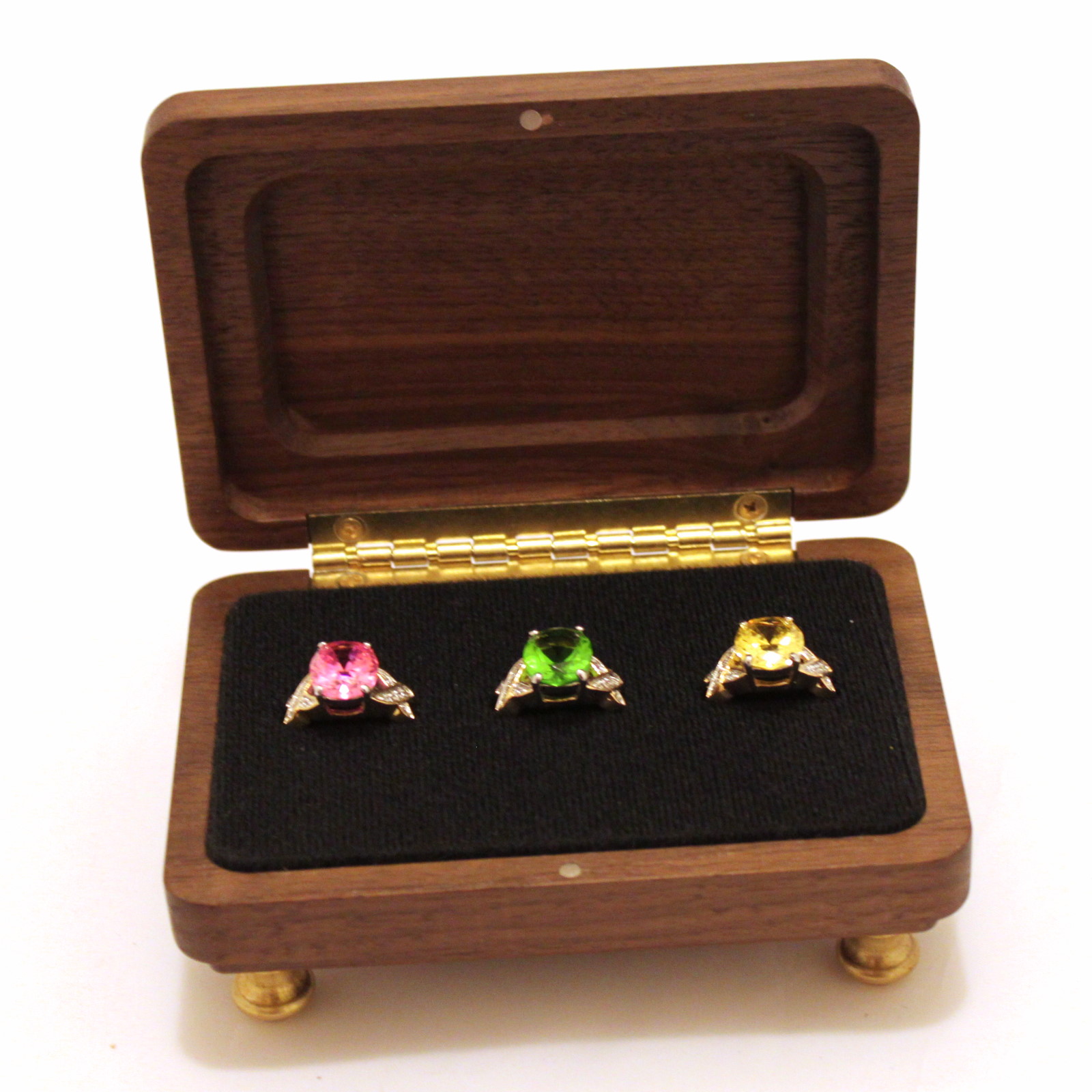 Effect: Using solid Walnut and secret Brass workings on the inside and out. This is a clever mechanical method of divining a secretly chosen ring with NO ELECTRONICS involved and easy to perform leaving you the ability to focus on your performance! The rings use beautiful Zirconia Jewels and real Gold and Silver Plating. The retail cost of the rings alone is near $125.00. The Ring Box was topped off with a beautiful yet subtle Brass Filigree and Solid Brass Feet.