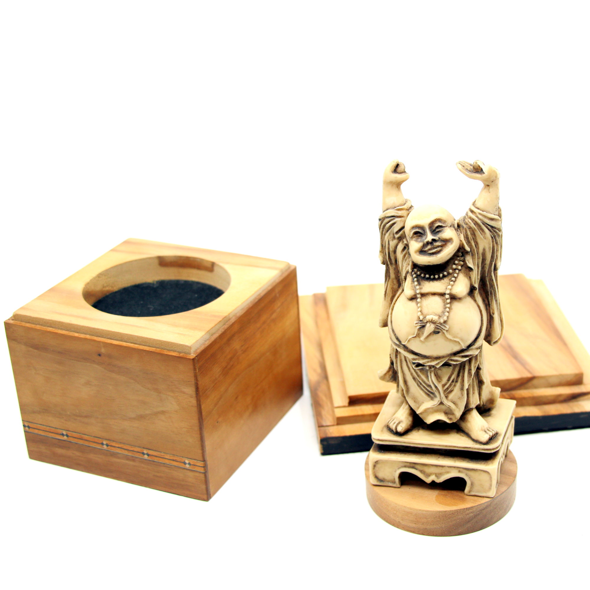This hand crafted apparatus, made of exotic hard woods, measures approximately 15″ wide, 5″ deep and 12″ high. Pedestal measures approximately 4″ square by 3″ high and the GOO idol is approximately 6″ high.