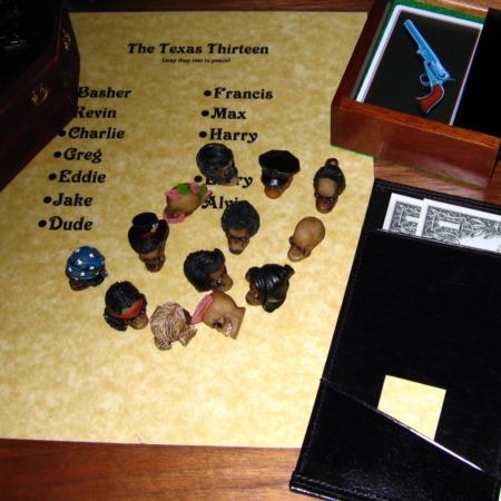Effect: A wallet with a prediction is placed on the table in front of the spectator. A small coffin is shown that is filled with Thirteen skulls – yes these are The Texas Thirteen – each man bad to the bone and met with various untimely deaths. A deck of cards featuring famous gunmen and murderers is shuffled freely by a spectator and placed in a small box for safe keeping. A list of the Thirteen is shown and the the Thirteen skulls (which are numbered on the bottom) correspond with these names. A spectator freely chooses any of the skulls and places it on top of the box.
