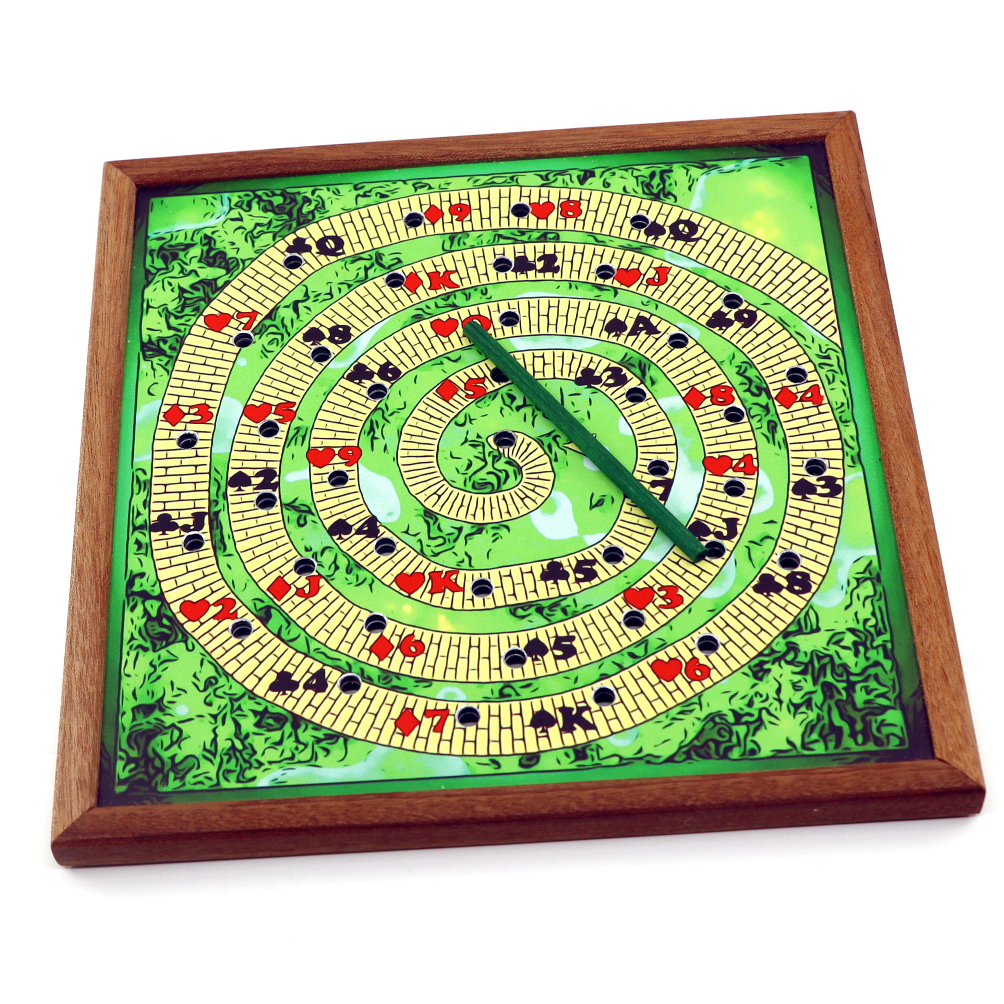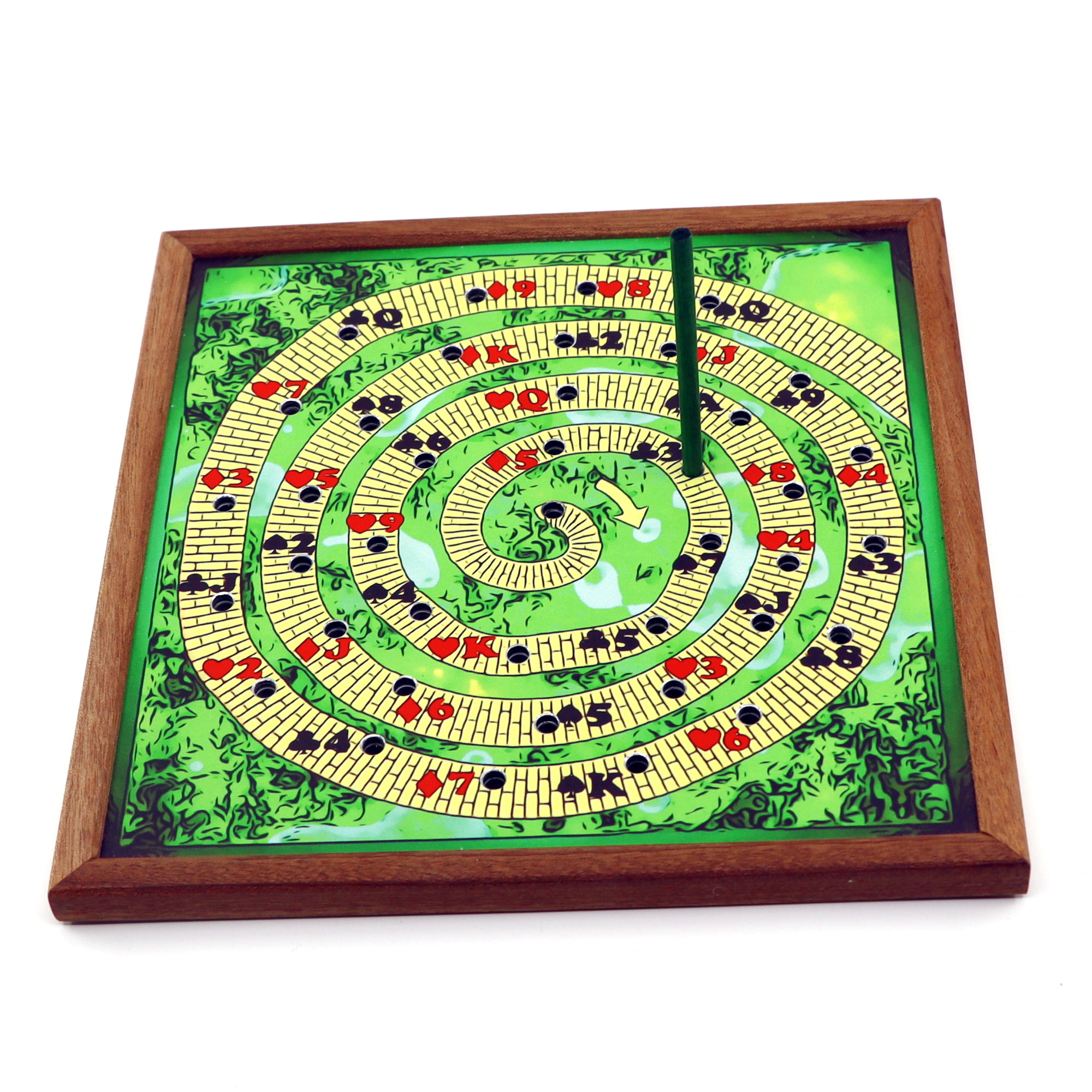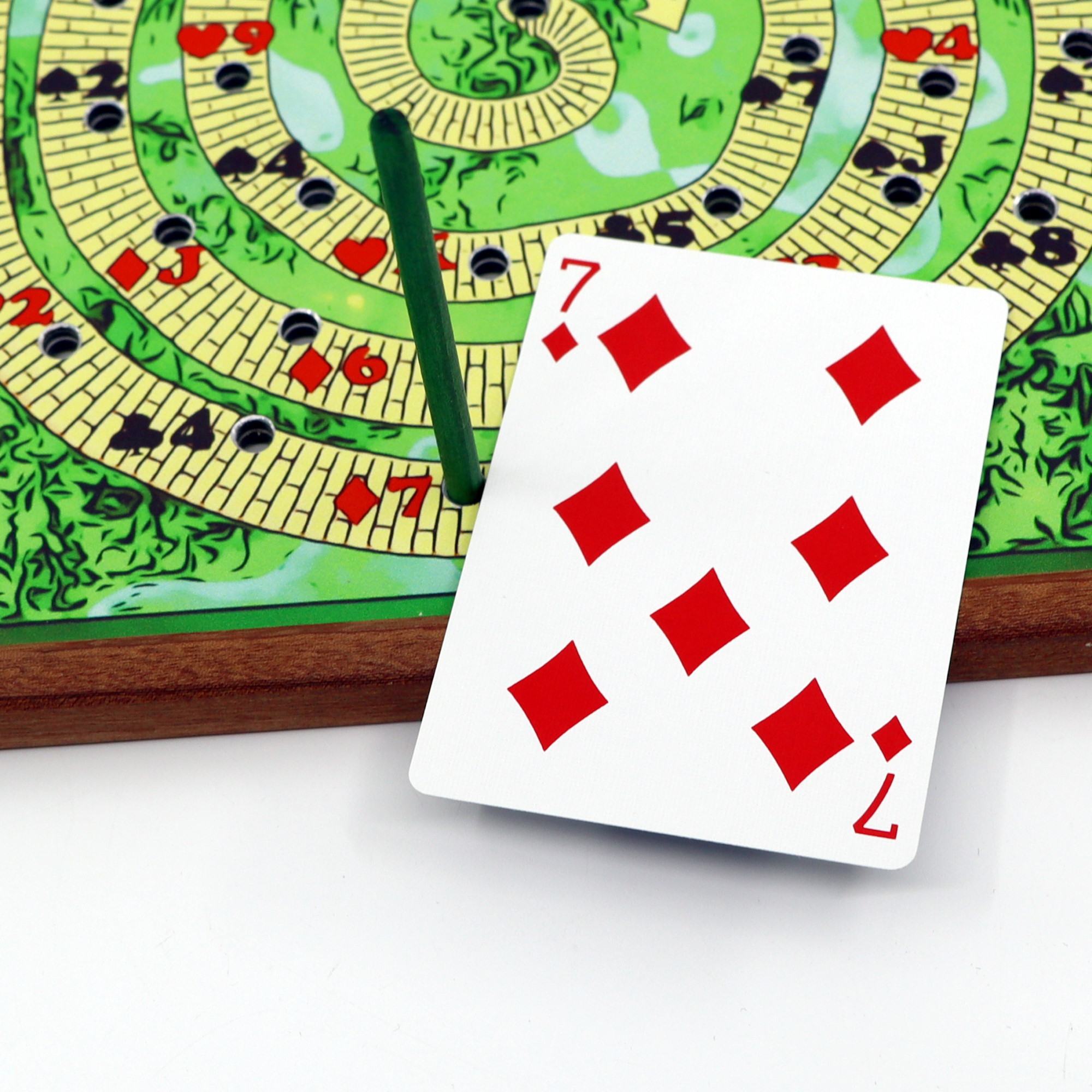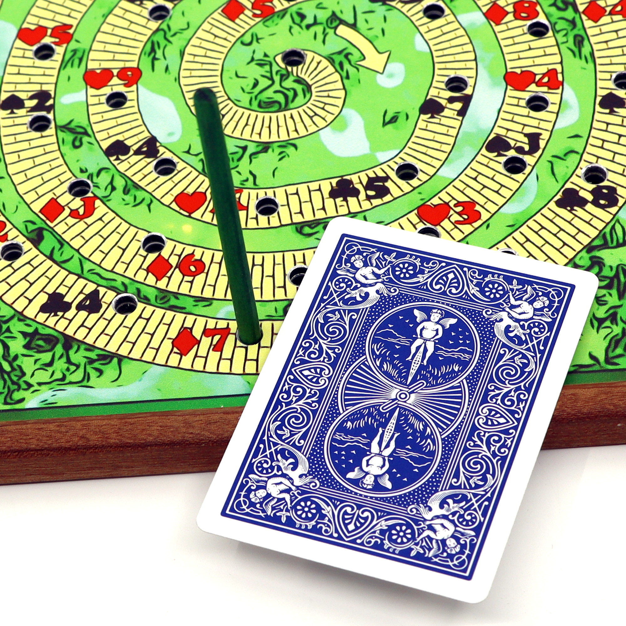 Effect: Ask your spectator to select their favorite number between 10 and 20, then count the number of holes outward (clockwise) from the center of the spiral drawn on the front of the board. Insert a straw into the hole where it stopped, turn the board over, count the same number outwards (clockwise) from the hole where the straw was inserted, and look at the name of the card where it stopped. Even though there was only one path and the spectator told a completely arbitrary number, the resulting card was predicted in advance.
