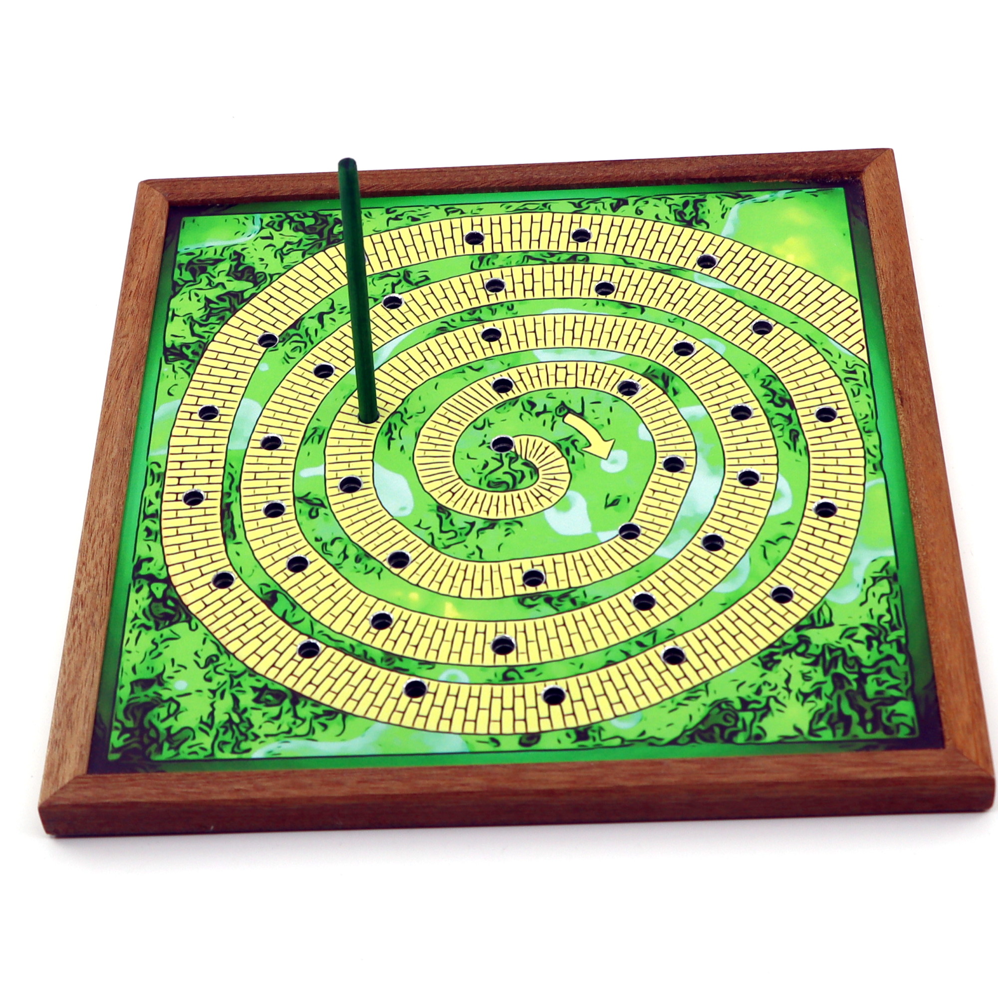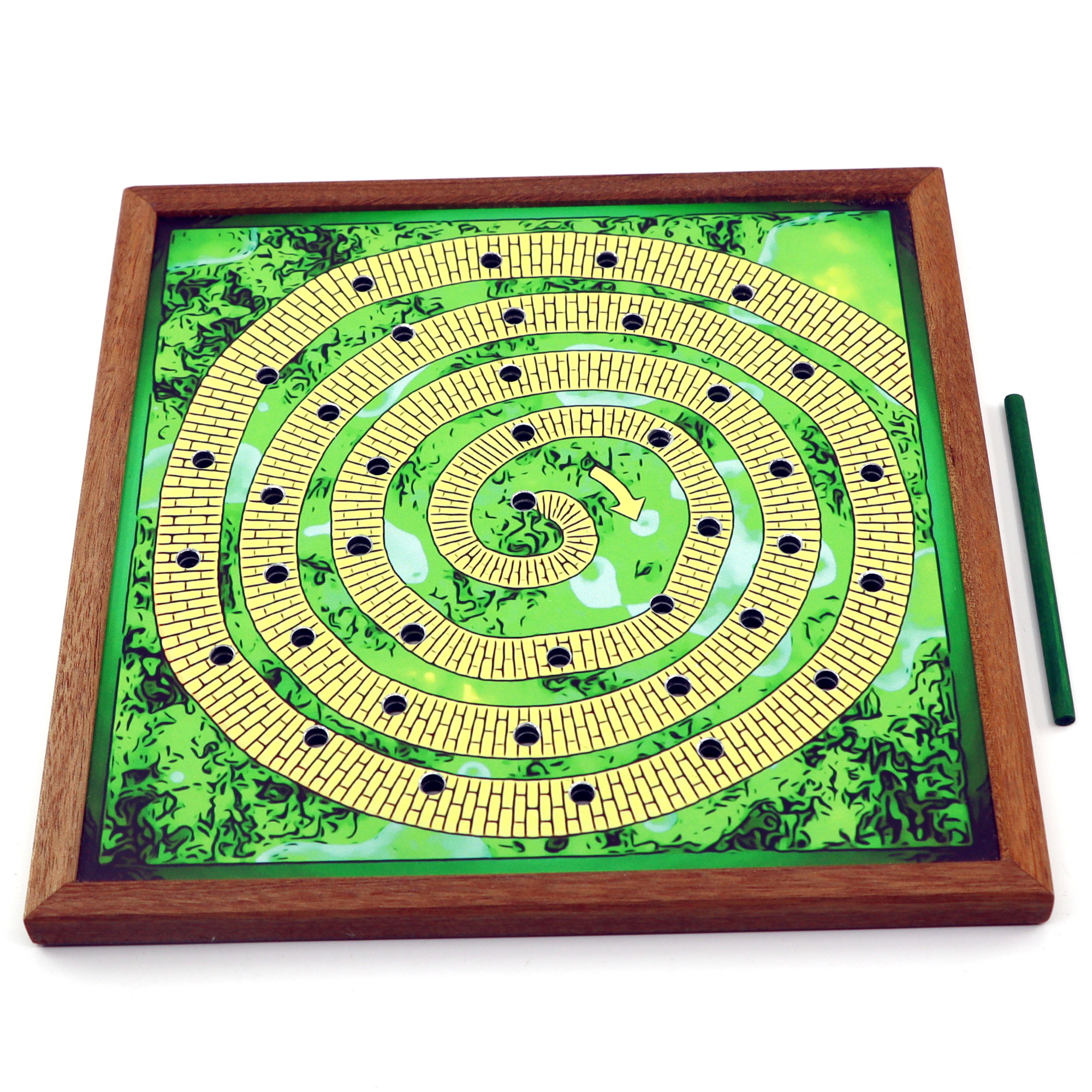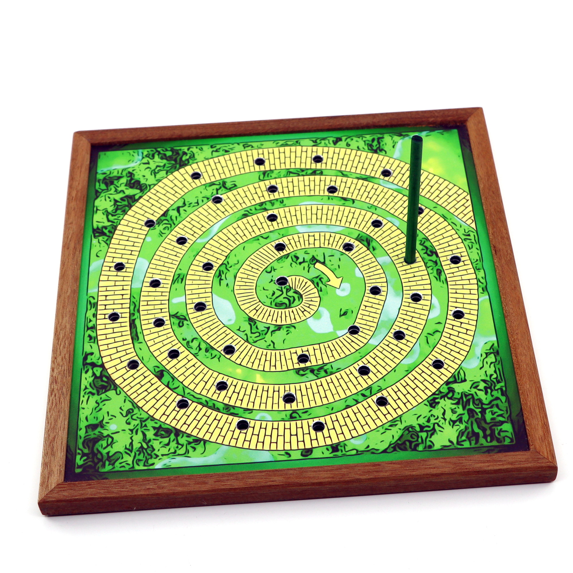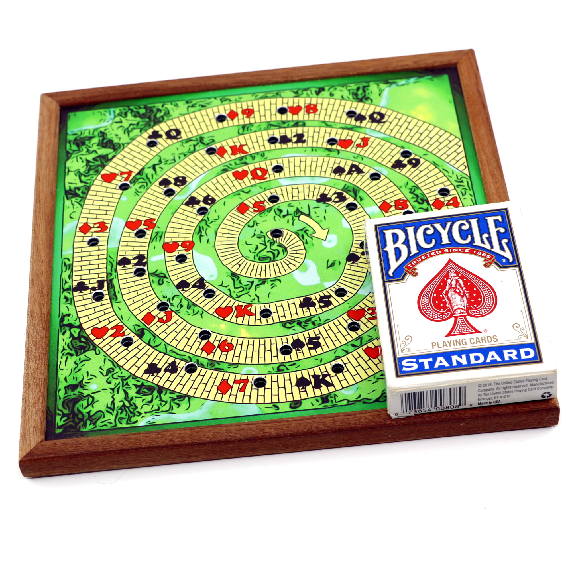 Effect: Ask your spectator to select their favorite number between 10 and 20, then count the number of holes outward (clockwise) from the center of the spiral drawn on the front of the board. Insert a straw into the hole where it stopped, turn the board over, count the same number outwards (clockwise) from the hole where the straw was inserted, and look at the name of the card where it stopped. Even though there was only one path and the spectator told a completely arbitrary number, the resulting card was predicted in advance.