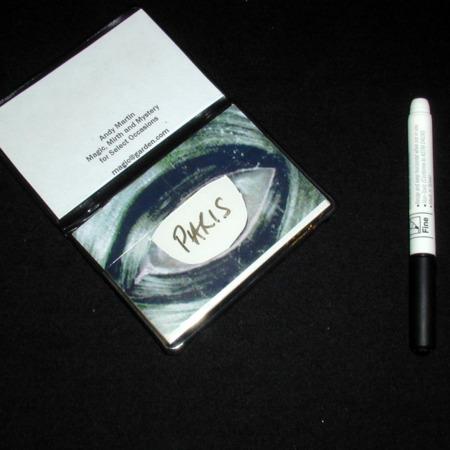 Effect: Here, on the other hand, is a high tech wallet from the man who calls the hardware store home, John Cornelius. John provides you with a black plastic wallet which measures approximately 3 x 4.5. A spectator writes some information (a number, an ESP symbol, the name of a playing card, etc.) on one of the inner surfaces of the wallet. (I should explain that there are two pads of paper under plastic on the inner surfaces of the wallet. The spectator uses a dry erase marker and writes on the plastic surface. This allows the message to be erased and the wallet reused without using up any paper.) The wallet is closed and a rubber band is snapped around it. The magician takes back the wallet and immediately discovers what has been written. This could be repeated indefinitely. (But why would you want to?)