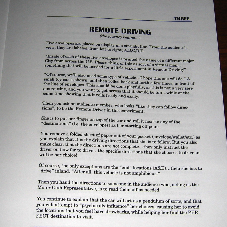 Remote Driving – A fun filled routine that is easy to do, yet is incredibly flexible in performance. This is a two-phased routine, in which you attempt to “influence” to which of five locations a spectator freely chooses to “drive” a small toy car. In the first phase, the spectator follows printed driving instructions that somehow direct her to a predicted location, although the performer has no control over which of five locations the spectator starts her journey or in what direction she decides to “drive” the car.