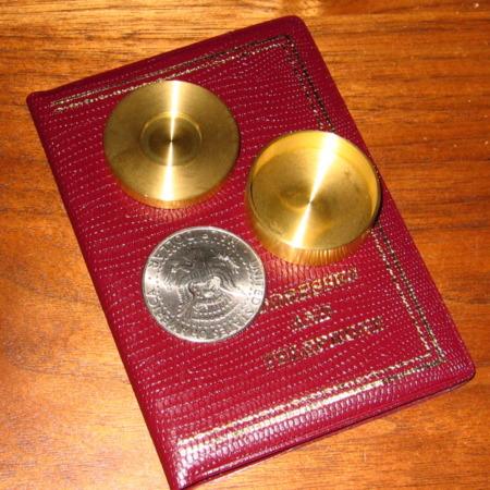 Effect: Here’s a simple five-phase routine: On your table sit two brass boxes. One is empty; the other holds four half-dollars. Dump out the coins and show them fairly one at a time. Place them inside one of the boxes and replace the lid. With a magical wave of your hand, one of the coins penetrates the box. Place it aside and dump out the three remaining coins. Show them one at a time and place them back into the box.
