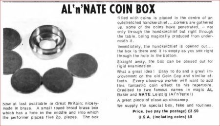 (c. 1934) (Submit Review) (Submit Update)The original version of this coin box was invented by Al Baker and Nate Liepzig c. 1934 and called the Al ‘N’ Nate Coin Box. This was the original effect: