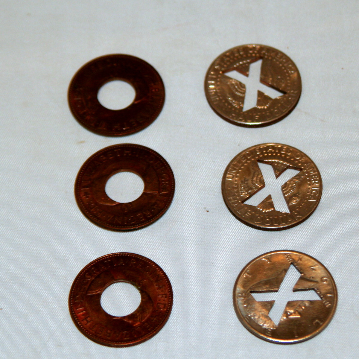Show your audience six coins; three copper and three silver. The copper coins have hugs drilled through them and the silver coins have kisses. These coins are separated, the three copper coins placed under one playing card, and the three silver coins placed under another playing card. With a snap of the fingers, two of the coins change place!