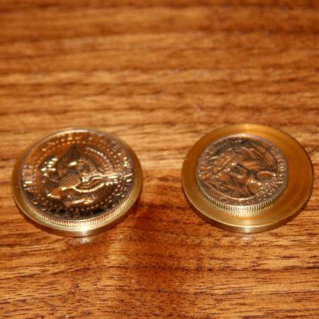 Effect: Four coins are shown both sides, two half dollars and two quarters, as well as two polished brass caps. One of each of the coins are covered by separate brass caps and are positioned four to six inches apart. The second quarter is placed on top of the cap containing the other quarter, and the same is done with the second half dollar. The performer lifts both caps and marker coins to show that each coin does, in fact, mark its counterpart. Now, without any false moves, the marker coins are switched position, i.e., the marker quarter is placed on the cap containing the half dollar, and the marker half dollar is placed on the cap containing the quarter.