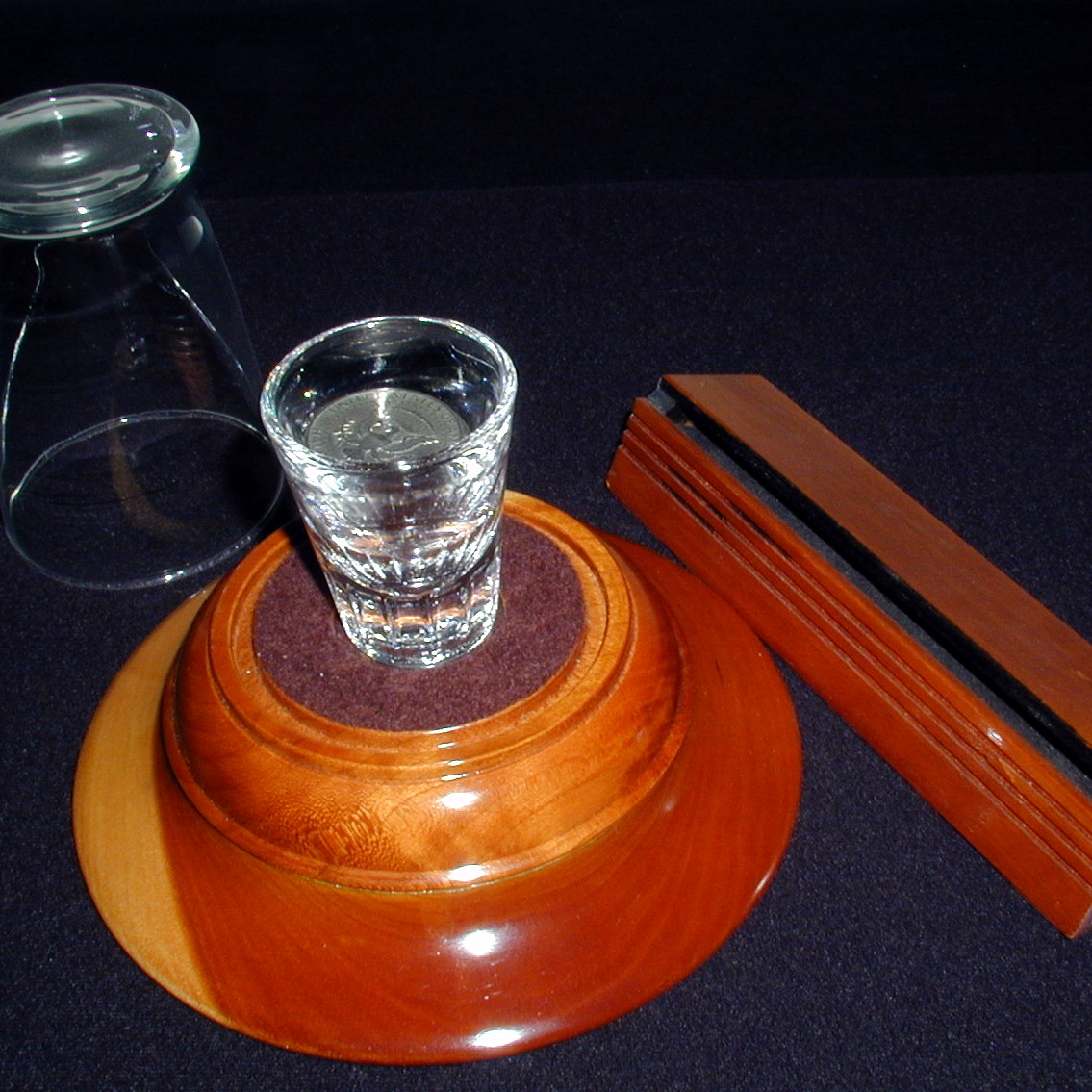 Effect: Four coins are placed in a stand. An inverted tumbler is set over a small glass on a pedestal which is held in your hand. You drape a handkerchief over the glasses. A coin is removed from the stand, thrown, and is heard to fall into the glass, apparently having penetrated the handkerchief and the tumbler. This is repeated. The audience appears skeptical, so you remove the handkerchief and show the two coins in the glass. Another coin is removed from the stand, and this time with no covering over the glasses, is actually seen to have passed through the tumbler and fall into the small glass. The visible penetration is repeated with the fourth coin. If desired, the complete effect may be performed without covering the glasses.