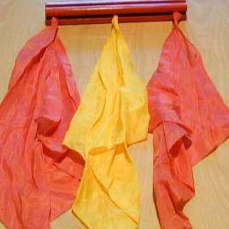 Effect: Hanging from a 14-inch pole are three 18-inch silks – two orange and a yellow. The performer claims that the yellow silk is an “Acrobat” and when the pole is placed behind the back the yellow silk jumps from one end of the pole to the other, and then back again. Up to this point, the audience suspects that the performer is simply turning the pole end for end behind his back. But wait! Now with a gesture of his hand the yellow silk VISIBLY, yes we said VISIBLY, changes places with the orange silk in the center!