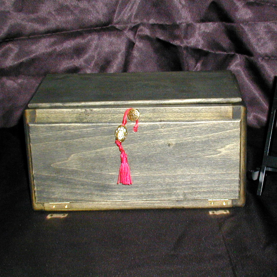 The box may also be used as a production piece. The load chamber will hold a large quantity of silks and ribbon. Boxed Queen Mystery is hand crafted from Italian Poplar and finished in ebony. The side graphics are done in gold foil and covered by durable clear vinyl. All fixtures are brass. The inside of the box is matte black. The box is 6 1/2″ X 11″ X 5 1/2″ deep. It has a top and a front lid so as to easily show the empty box. The gimmick fits snugly enough so as to be camouflaged yet it is loose enough to make retrieval of the large Queen an easy process. The large Queen card is 6 3/4″ X 9 1/2″. You can get quite a bit in the box.