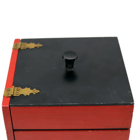 The outfit is beautifully made and decorated and will add class to any act, large or small. A marked half-dollar sized coin is vanished (using a coin vanishing hank). Attention is called to a red and black box with brass hinges. A spectator opens this box and inside is a gold box.