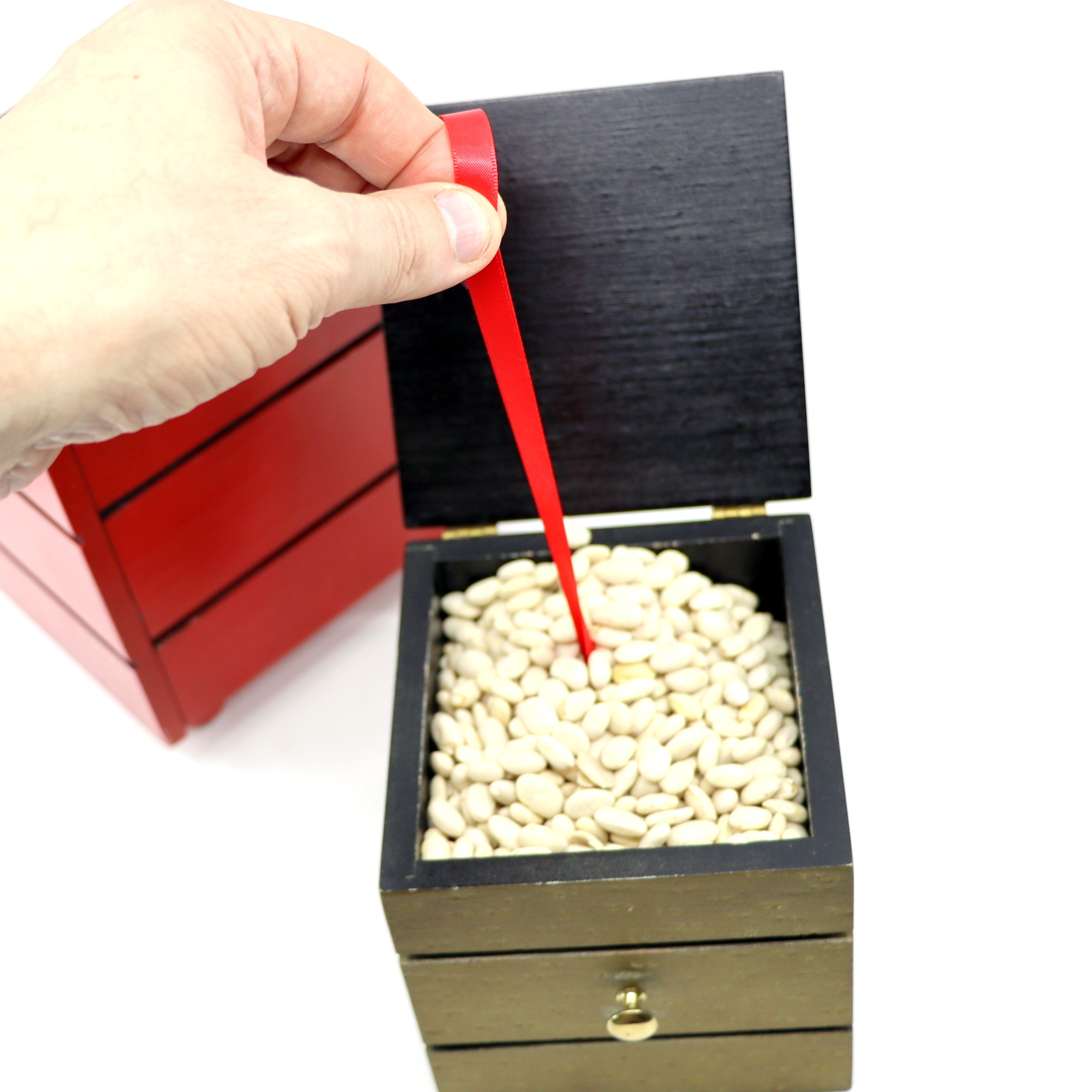In the Abbott’s advert it talks about tying the outer and inner box with a ribbon – this is certainly possible, but because of the astonishment created by pulling the tiny box out of all of the beans I don’t think it adds anything to the effect and just slows down the pace. But of course you could use ribbons if you wanted to (and I even include some for you).