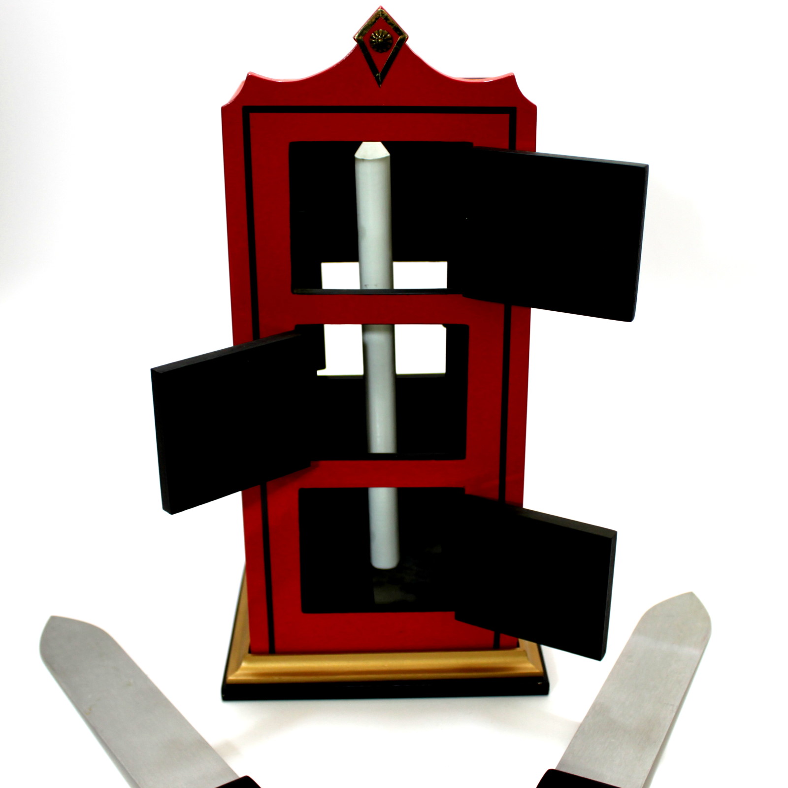 Effect: An examined candle is placed in an elaborate Chinese tower with doors open to show candle in position. Doors are closed, two metal daggers inserted, and doors reopened to show middle portion of candle has vanished. Whole candle is then restored. Unusual and highly decorative.