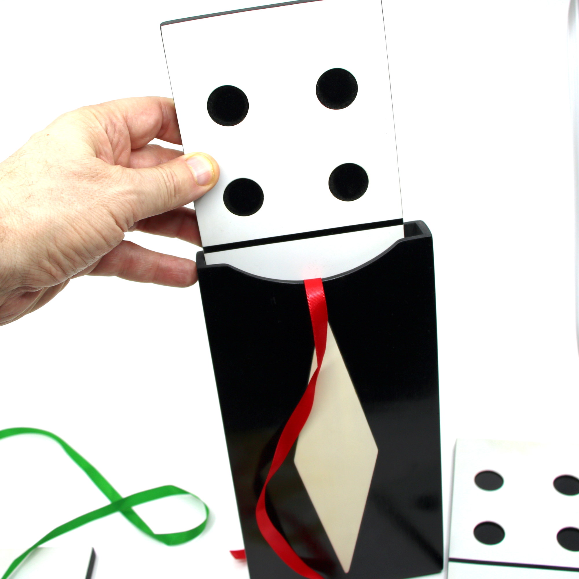 Effect: Three large WHITE-FACED dominoes with BLACK SPOTS and a slim, empty wooden cover are freely displayed? A red ribbon is draped over the open end of the cover and one of the dominoes is dropped into the cover. Some of the ribbon is, of course, forced down into the cover by the weight of the domino, but the ends of the ribbon remain outside the cover.