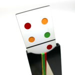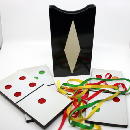 The performer now takes hold of the ends of the ribbon and pulls downwards on them. This action causes the domino to rise out of the cover and it is now seen that THE DOMINO’S BLACK SPOTS EAVE CHANGED TO RED, matching the color of the ribbon. The effect is repeated with the second domino, using a green ribbon, and again the spots on the domino change, this time to green. This leaves the performer with one more domino and a yellow ribbon, but this time he decides to drape not only the YELLOW RIBBON over the cover but the RED AND GREEN ones previously used as well. The last domino is then dropped into the cover, the three coloured ribbons are pulled downwards and A MULTI-COLORED DOMINO IS REVEALED – A GREAT CLIMAX TO AN UNUSUAL, COLORFUL EFFECT!